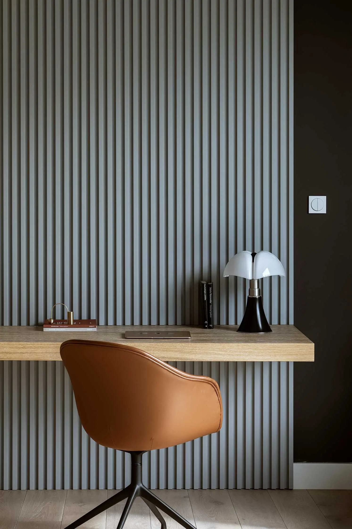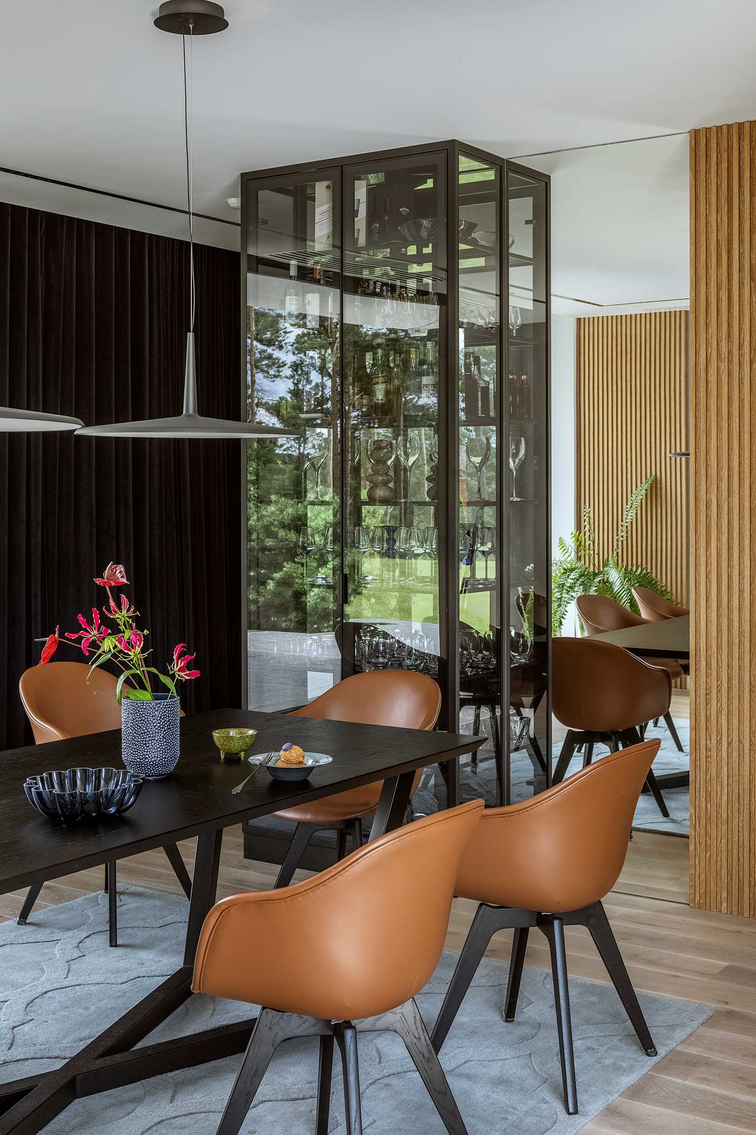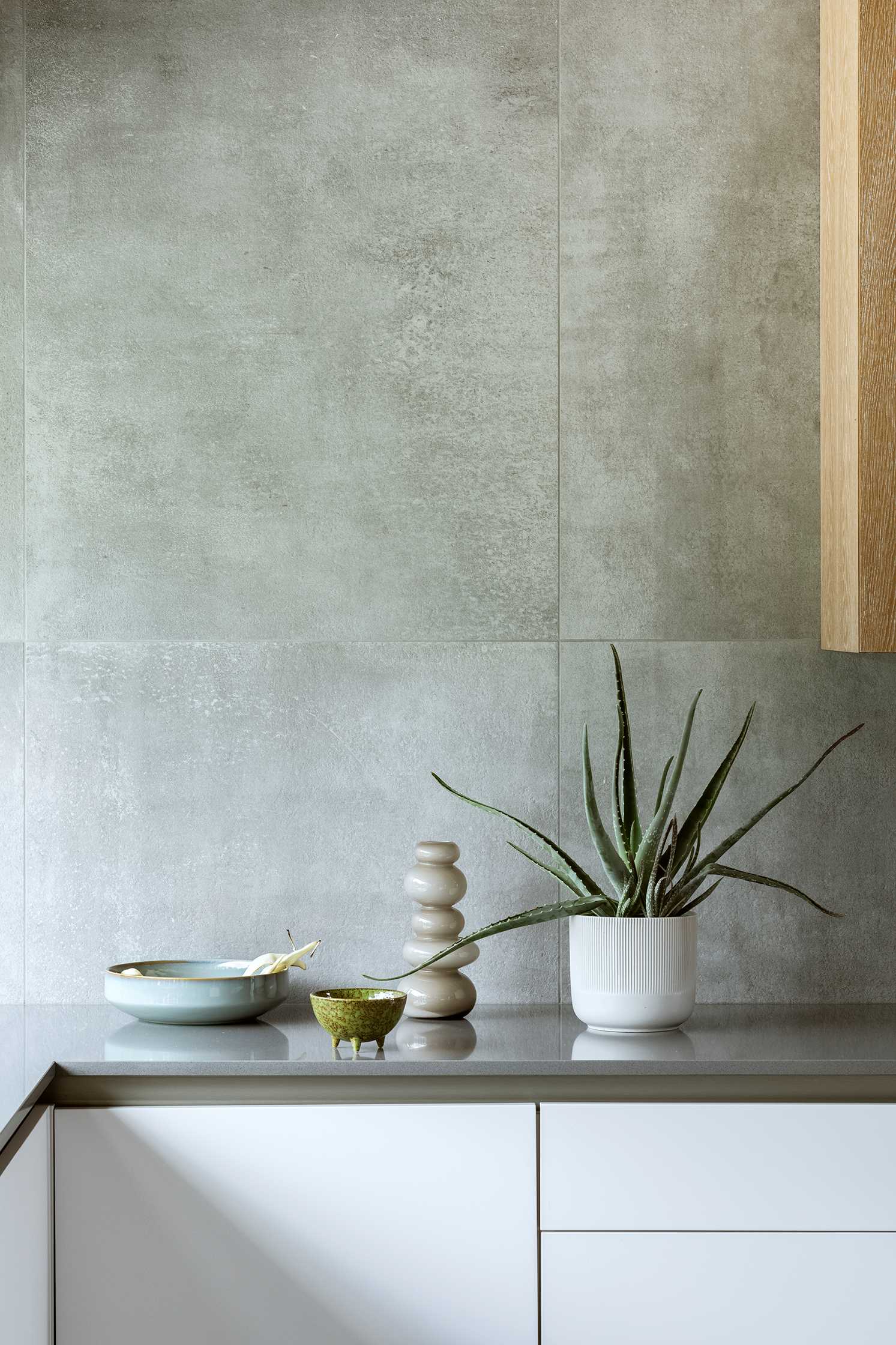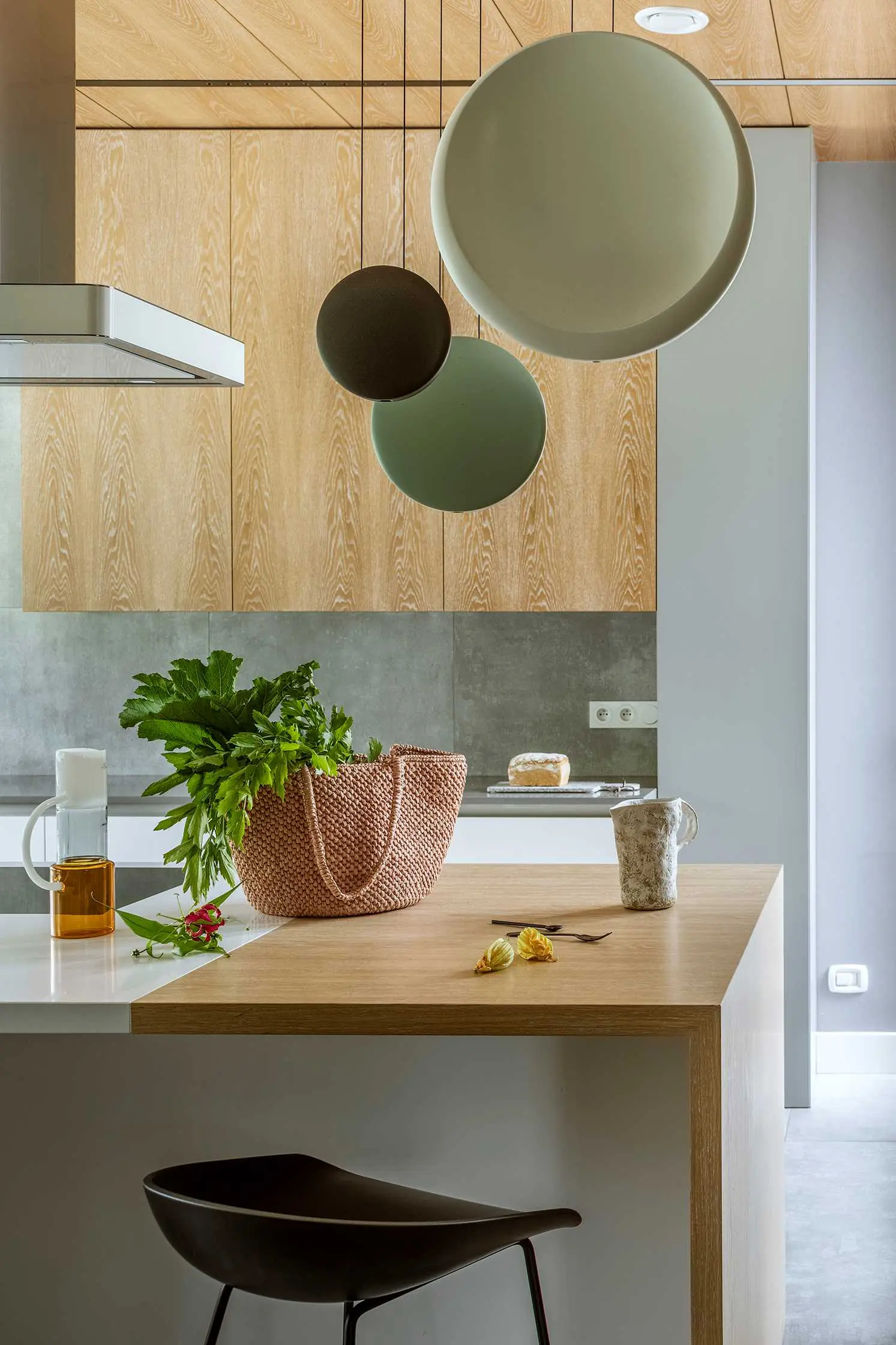 Sercem domu jest przestronna kuchnia, urządzona tak, aby z przyjemnością można było przygotowywać posiłki wspólnie z całą rodziną. Surowość płytek imitujących beton ociepla drewniana wyspa oraz ciekawe rozwiązanie, jakim jest drewniany sufit. W nim zainstalowano szynowe techniczne oświetlenie. Wyspę ozdabiają ikony designu lampy Vibia Cosmos. Mocnym kontrapunktem tej kuchni jest ciemna szafa z dużą ilością miejsca do przechowywania, z piekarnikiem i zabudowaną lodówką.