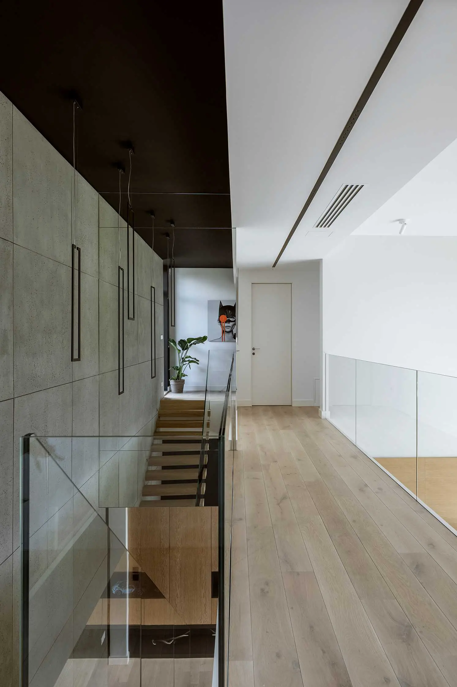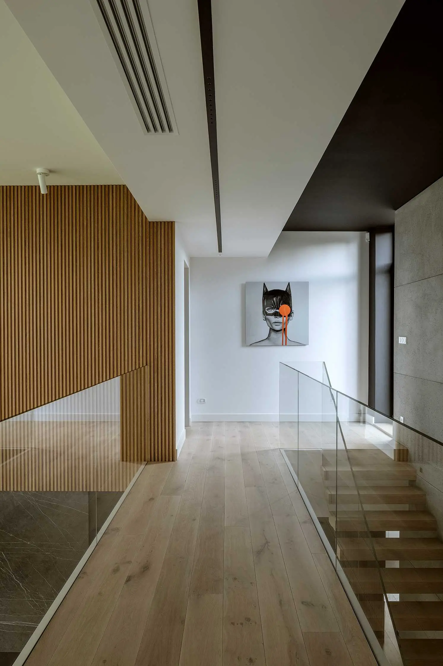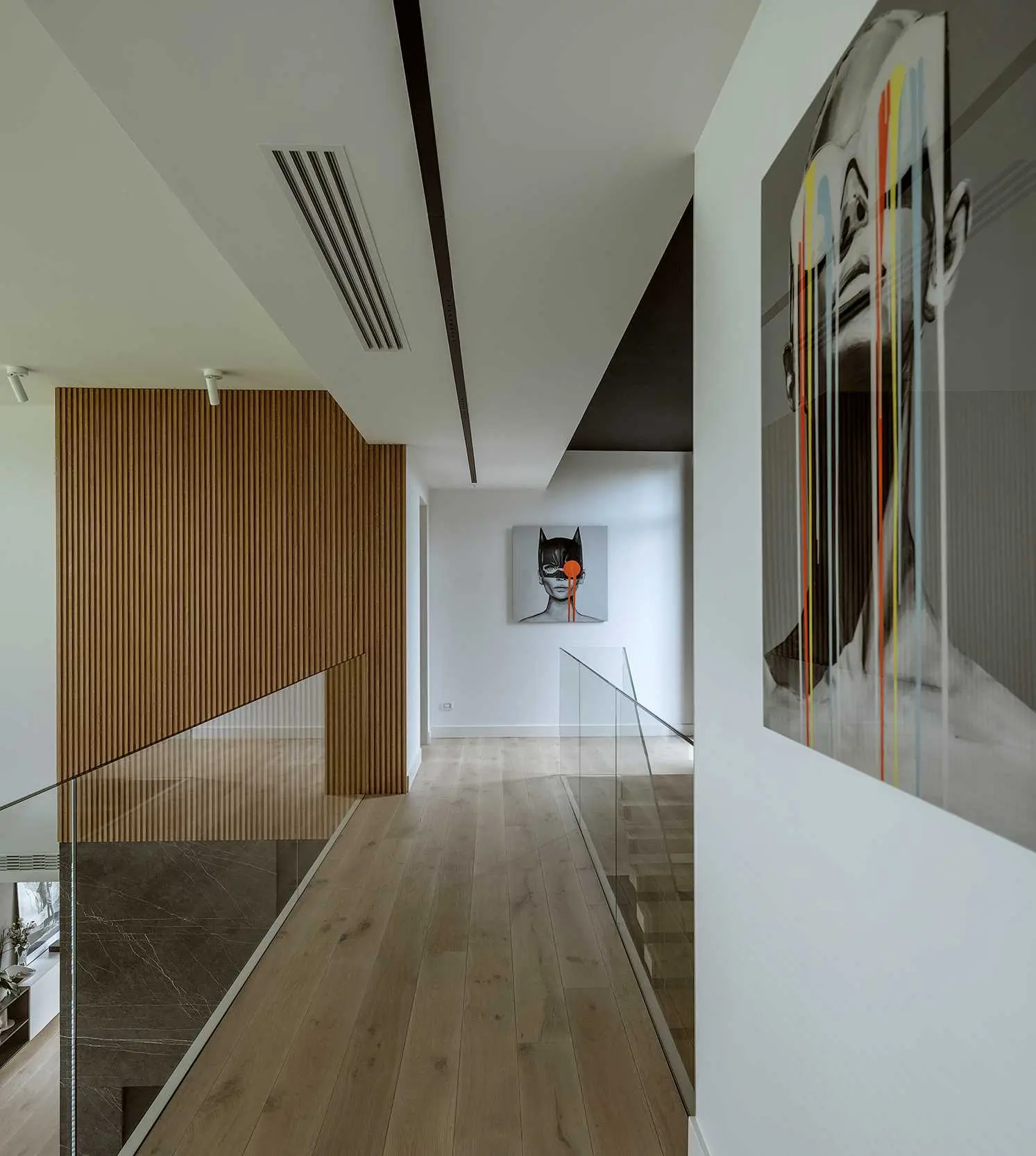 Reprezentacyjny korytarz stanowi wizytówkę całego domu. Jest on zapowiedzią niezwykłego wzornictwa jakie zostało użyte w całym domu. Duże znaczenie ma tu oświetlenie, które dobierane jest indywidualnie do potrzeb użytkownika. Jasny korytarz jest podstawą współcześnie zaprojektowanych domów. Ten nowoczesny przedpokój jest urządzony z dbałością o najmniejszy detal, robi pozytywne wrażenie już od pierwszego przekroczenia progu. W przestrzeni tej postawiono na oświetlenie techniczne, takie jak: oprawy wpuszczane, natynkowe.