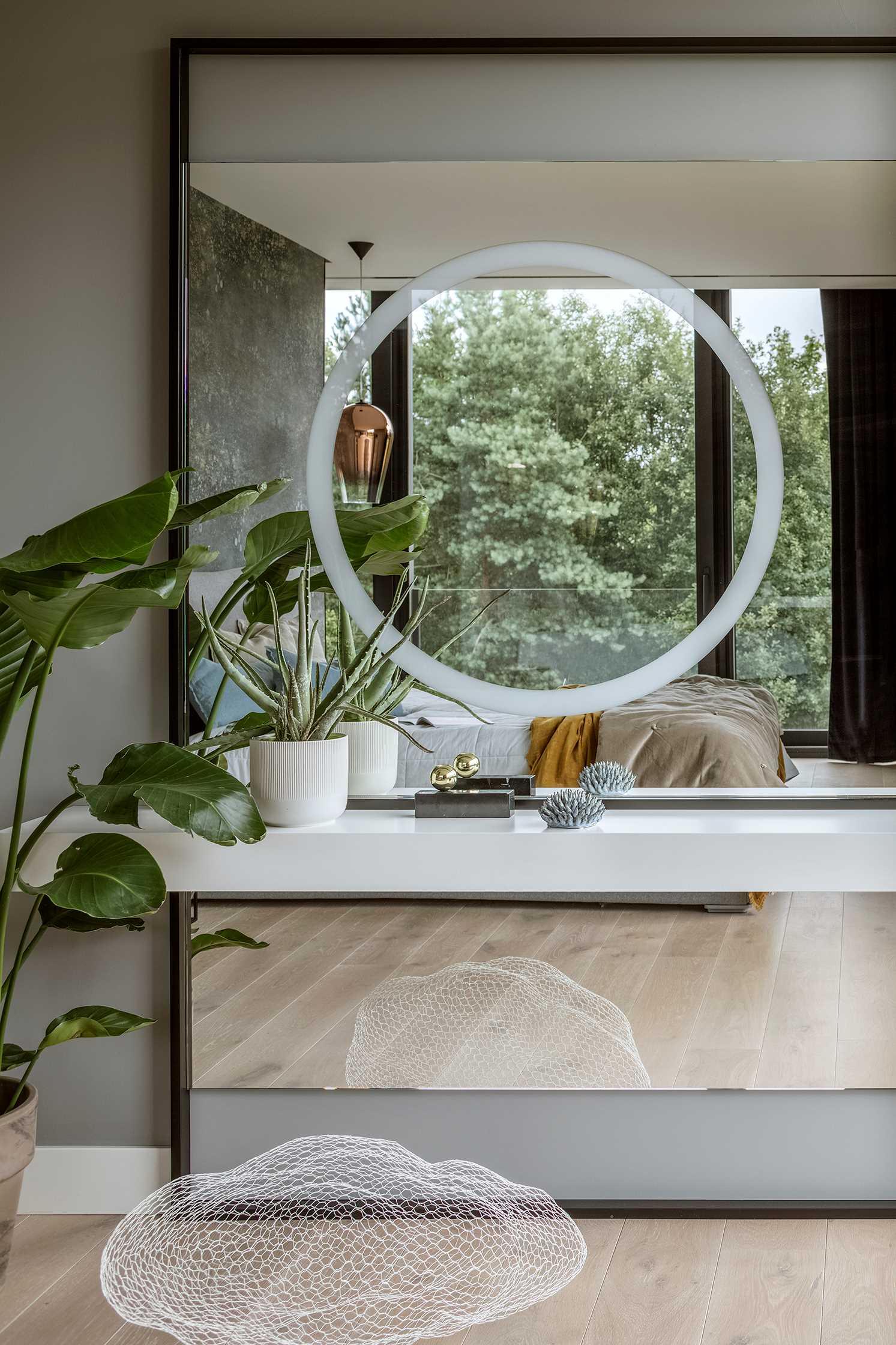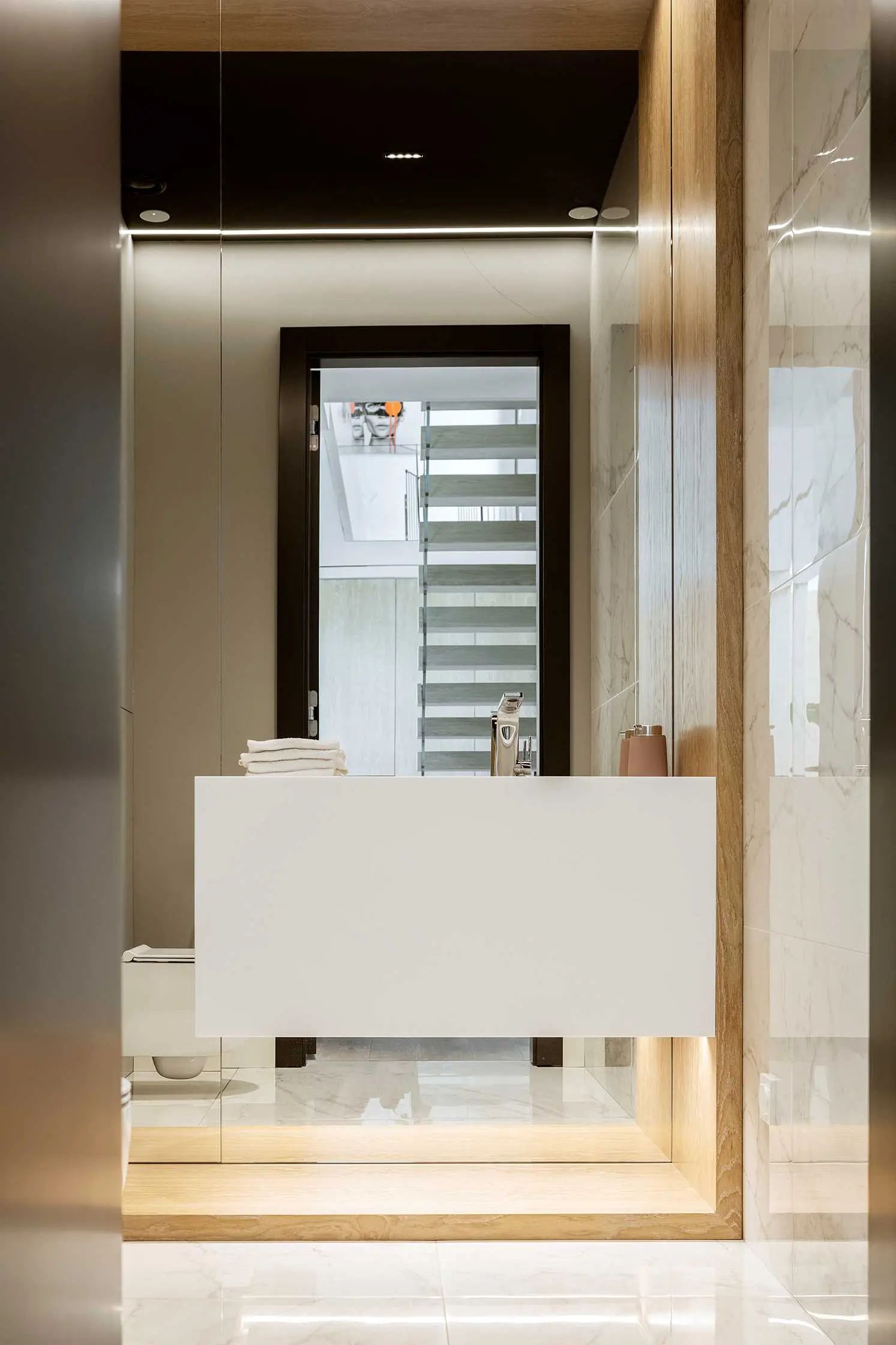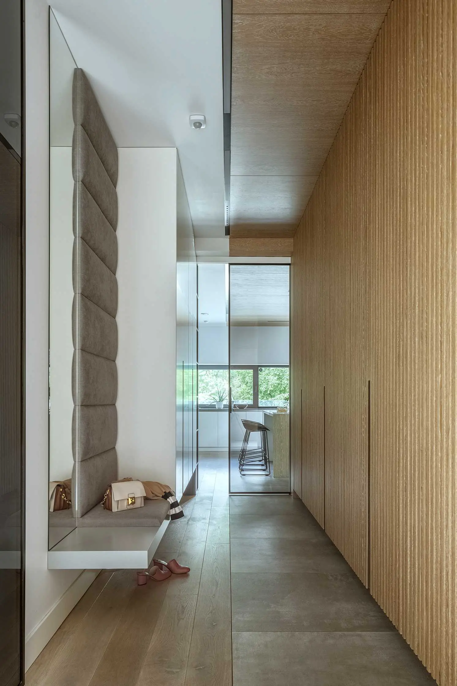 Reprezentacyjny korytarz stanowi wizytówkę całego domu. Jest on zapowiedzią niezwykłego wzornictwa jakie zostało użyte w całym domu. Duże znaczenie ma tu oświetlenie, które dobierane jest indywidualnie do potrzeb użytkownika. Jasny korytarz jest podstawą współcześnie zaprojektowanych domów. Ten nowoczesny przedpokój jest urządzony z dbałością o najmniejszy detal, robi pozytywne wrażenie już od pierwszego przekroczenia progu. W przestrzeni tej postawiono na oświetlenie techniczne, takie jak: oprawy wpuszczane, natynkowe.