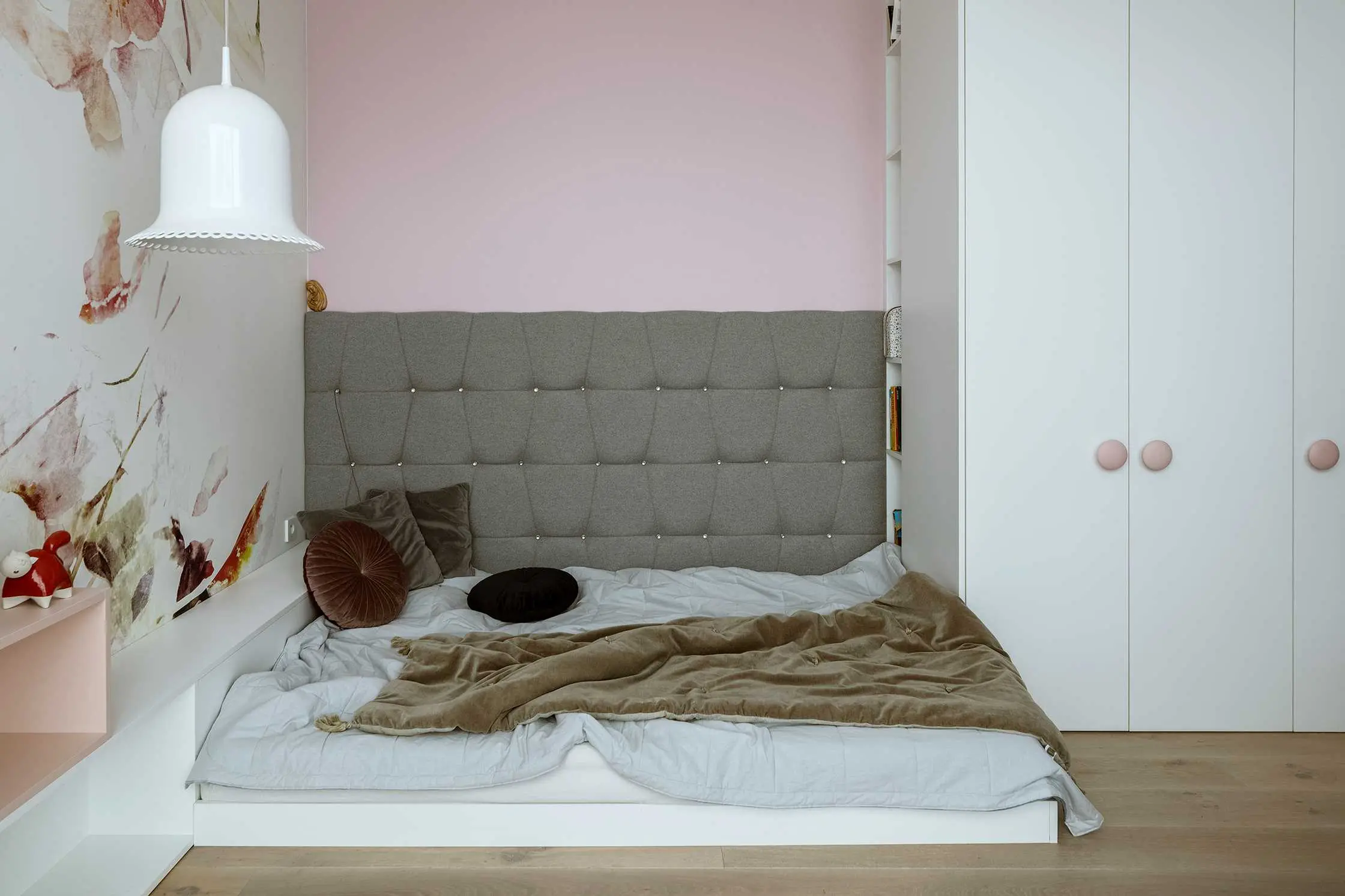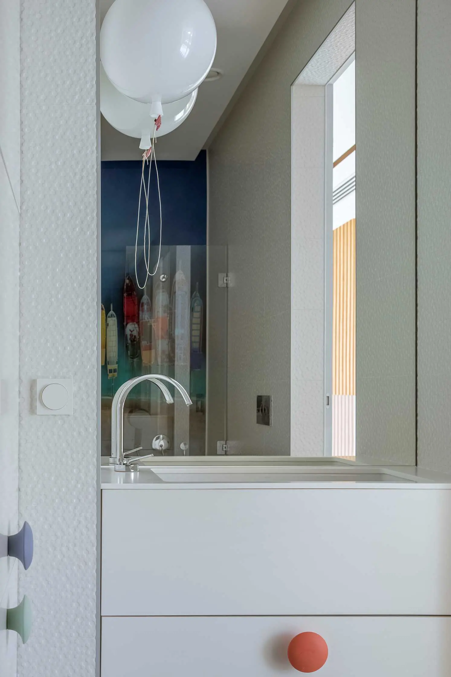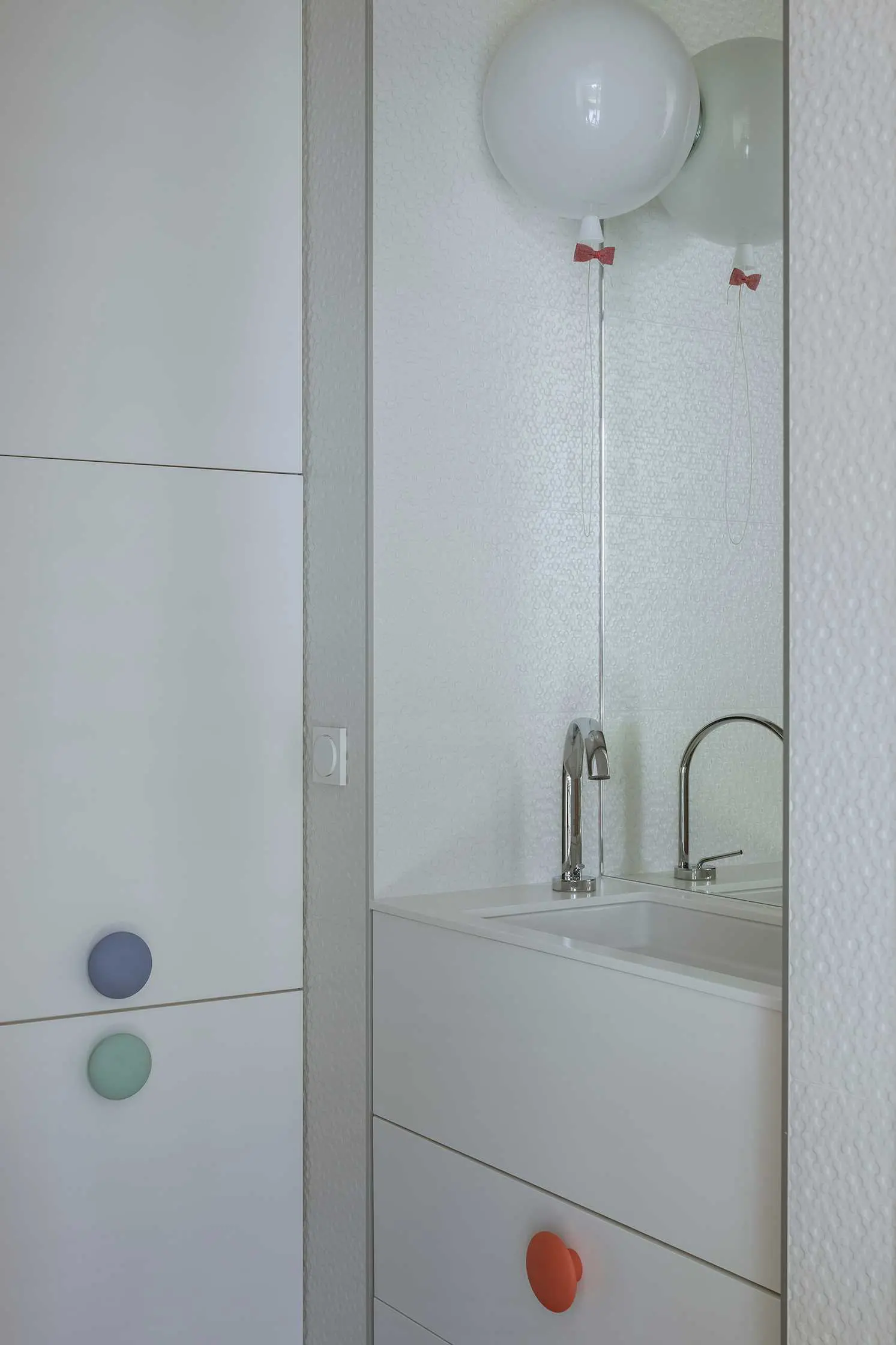 Łazienka dziecięca jest biała, minimalistyczna lecz nie brakuje jej zabawnego akcentu w postaci lampy Brokis Memory oraz kolorowych uchwytów przy szafkach.
