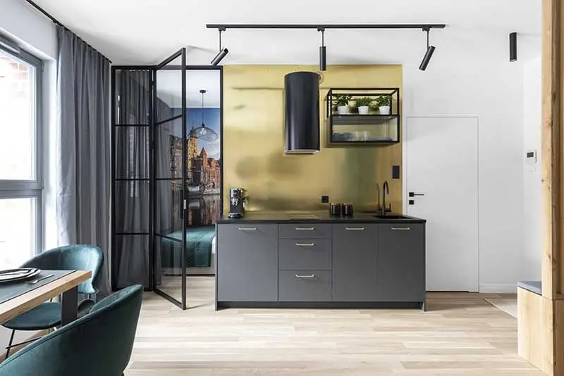 Wnętrze jest niewielkie lecz dzięki zastosowanym rozwiązaniom czuć przestrzeń i dużo naturalnego światła. Aneks kuchenny znakomicie wkomponowany w strefę dzienną stanowi bardzo ciekawy atut tego wnętrza. Po zmroku dzięki nastrojowemu oświetleniu i lekko mieniącej się złotem ścianie, pomieszczenie stają się istną oazą relaksu.