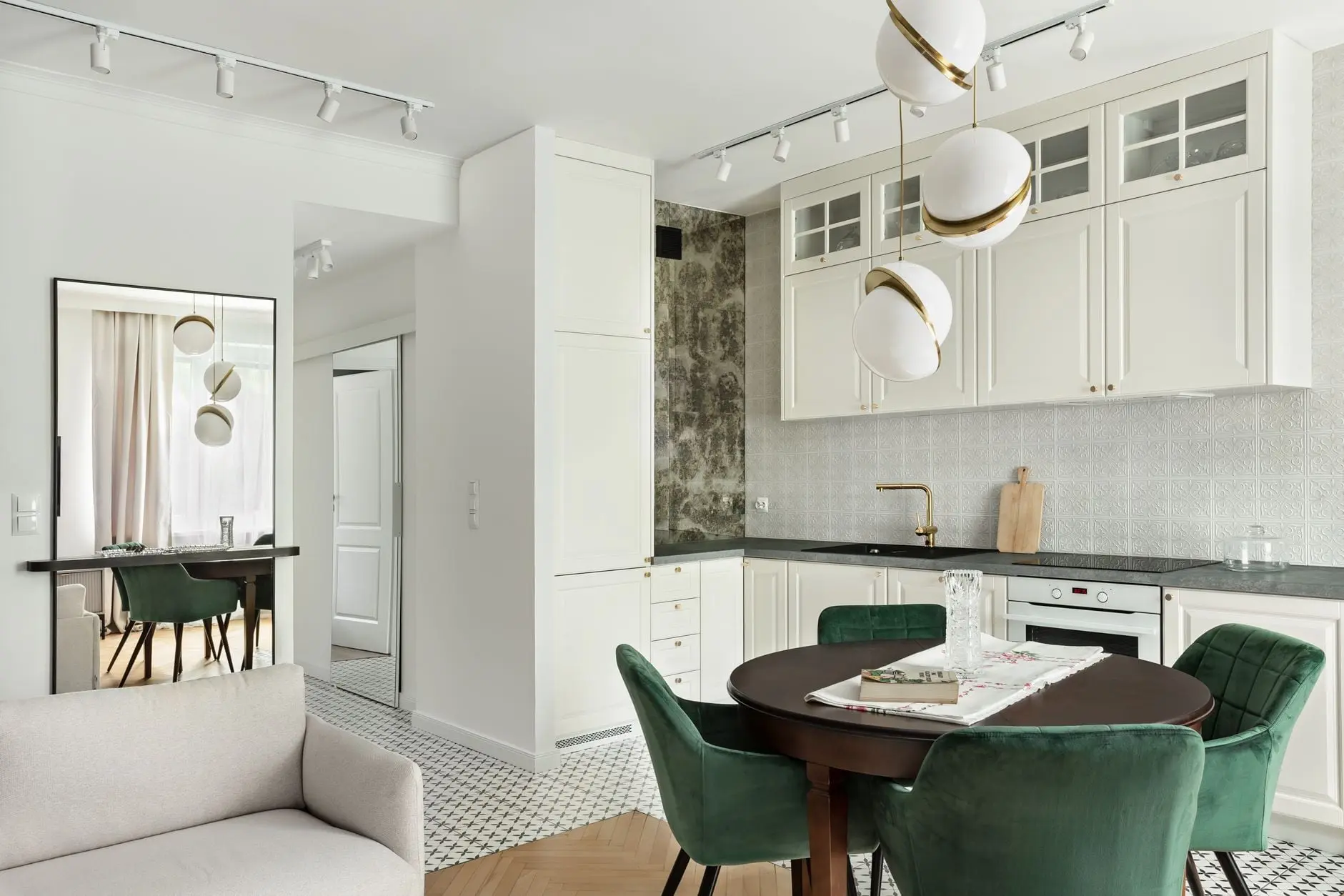 Historia przemiany tej skromnej przestrzeni jest fascynująca. Początkowo mieszkanie składało się z ciemnego przedpokoju, kuchni, łazienki, sypialni i niewielkiego salonu. Architekt, z wyjątkową wizją, postanowił przekształcić to miejsce w prawdziwe arcydzieło sztuki wnętrzarskiej, korzystając z eleganckiej bieli oraz delikatnych, zielonych akcentów, a także włączając do aranżacji antyczne przedmioty.