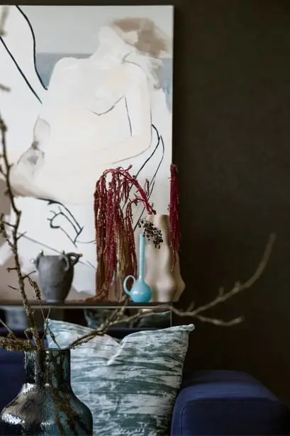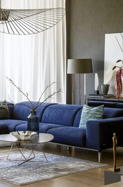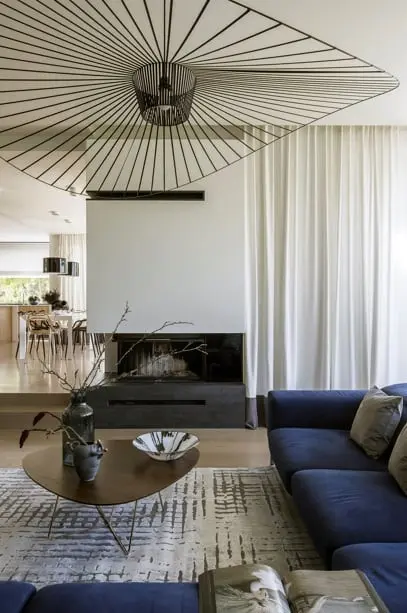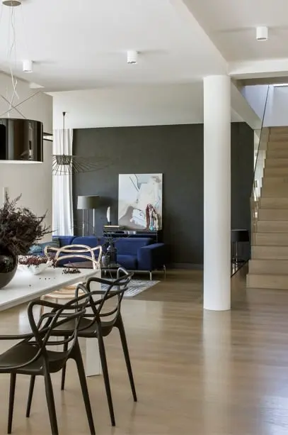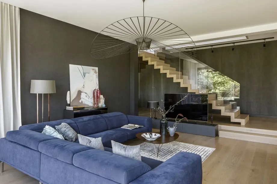 W części wypoczynkowej, znajduje się narożny kominek, stolik kawowy i mocny akcent w postaci granatowego narożnika. Ten kolor jest nieprzypadkowy to znak rozpoznawczy architektki Wioletty Niedzieli-Bogusz, która najchętniej w swoje aranżacje wplata granatowy kolor. Zwieńczeniem aranżacji w salonie jest obraz autorstwa Tomasza Pilitowskiego, wazon studia Mosco Ceramics oraz rzeźba Beaty Boguckiej wyeksponowane na konsoli pod obrazem.