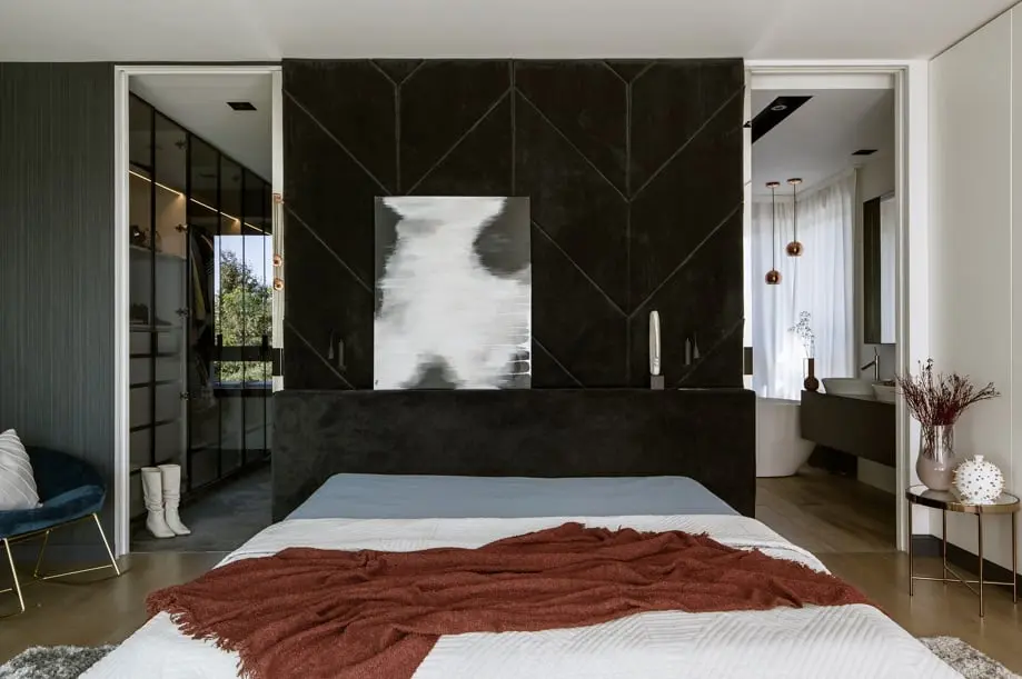 Strefa prywatna na piętrze domu pozostaje spójna z parterem tworząc prostą, elegancką i funkcjonalną przestrzeń. Architektka przewidziała i tutaj szereg dyskretnych rozwiązań do przechowywania. W głównej sypialni, po obu stronach łóżka wchodzimy przez lustrzane drzwi do garderoby i do łazienki.