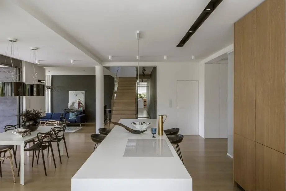 Imponujące przeszklenia w domu dają poczucie obcowania z otaczającą dom naturą. Odpowiadając na potrzeby właścicieli domu, architektka dokonała rewolucji w układzie części parterowej. Centrum parteru stanowią schody wykonane z jasnego drewna, ozdobione gładkimi szklanymi taflami. Harmonijny, przestronny parter został sprytnie zaplanowany. Dzięki szafkom i schowkom sprawia wrażenie czystej, jednolitej powierzchni.