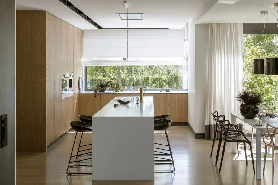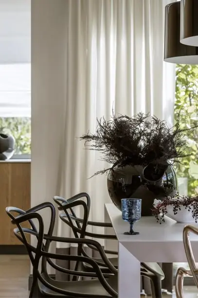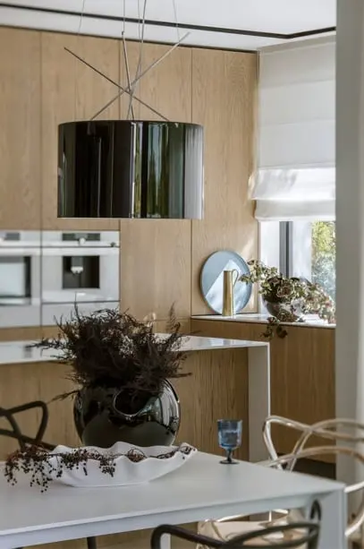 Sercem kuchni jest delikatna biała wyspa, idealna do przygotowywania posiłków, szybkiej konsumpcji czy wieczornego celebrowania. W lekkość wnętrza idealnie wpisują się krzesła dobrane zarówno do wyspy jak i stołu w jadalni.