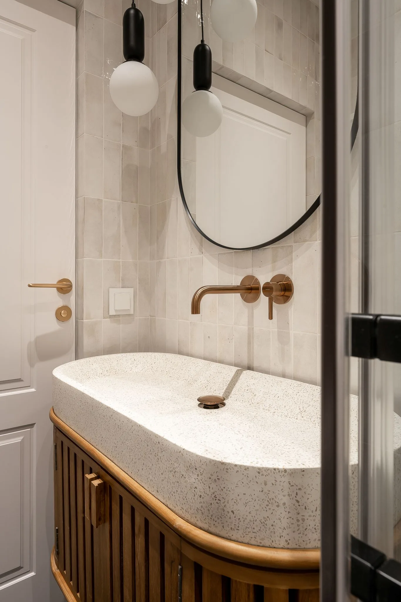 Całość projektu została utrzymana w duchu mid-century modern – stylu, który ceni proporcje, ponadczasowe linie i grę barw.