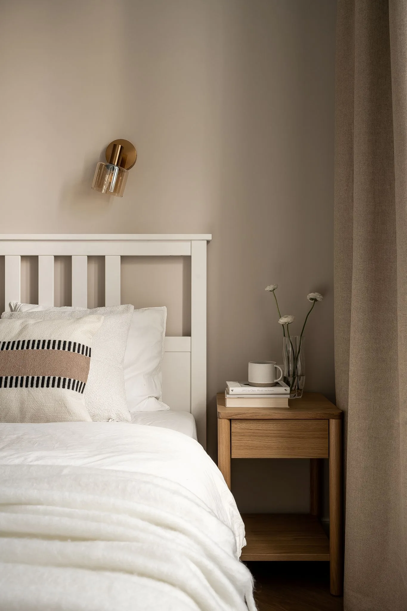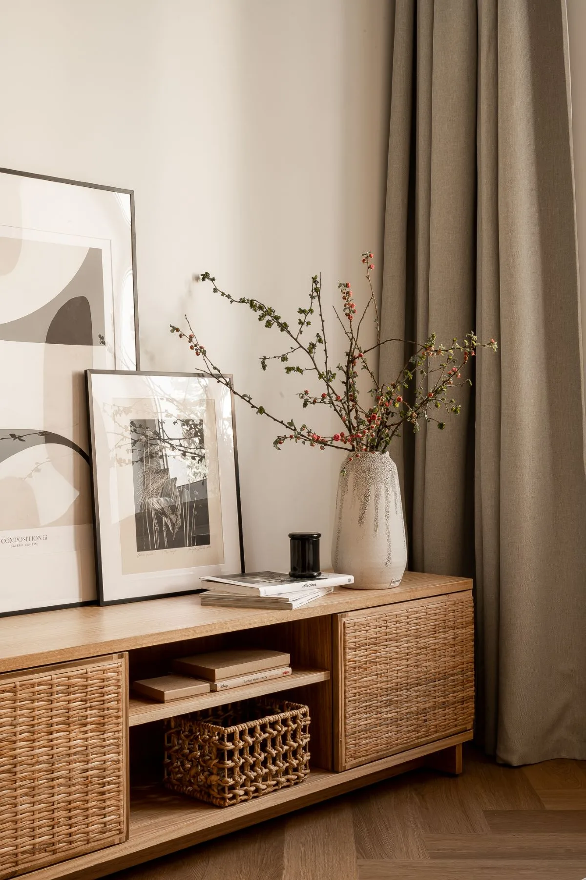 Baza kolorystyczna: neutralna, stonowana paleta – biel, beż i naturalne drewno – buduje spójne tło.
