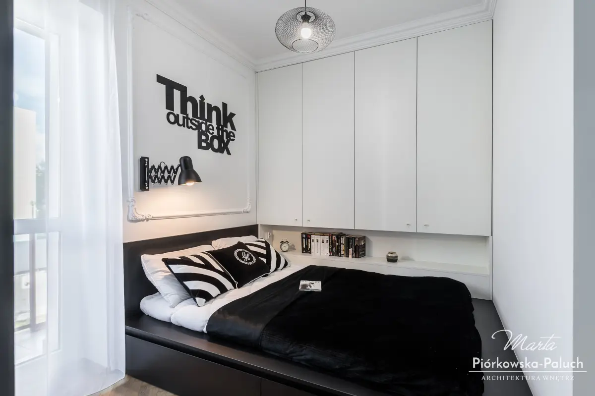 Nad łóżkiem w sypialni znajduje się motto, które przyświecało architektce Marcie Piórkowskiej – Paluch przez cały proces projektowania tego mieszkania.