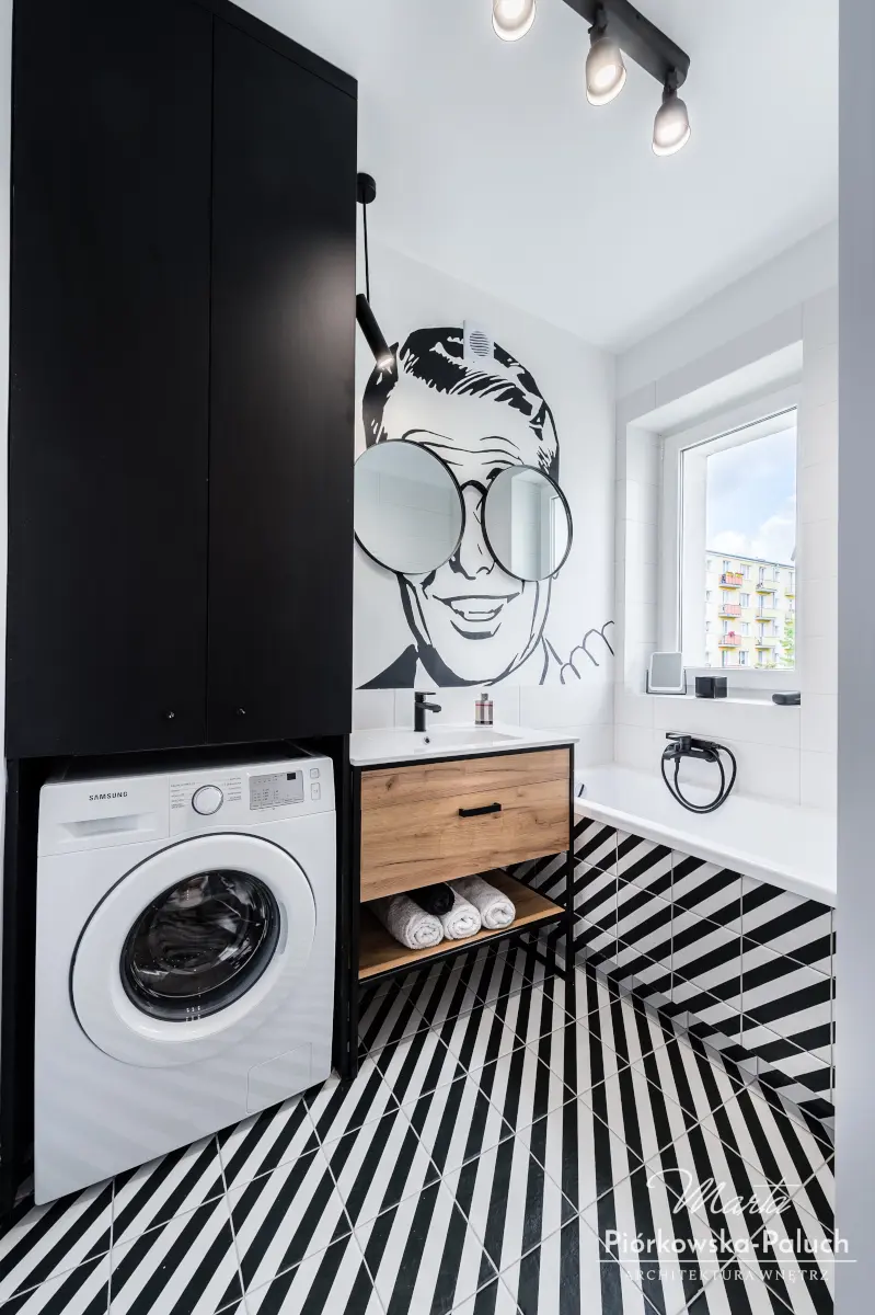 Z sypialni możemy przejść do wyjątkowej łazienki utrzymanej w biało – czarnej kolorystyce. Oprócz wyrazistych płytek, elementem który przykuwa wzrok jest oryginalne lustro nad umywalką stworzone z „okularów”. Miejsce do przechowywania znajduje się w szafce nad pralką. Nieco ciepła wnętrzu dodaje drewniana szafka.