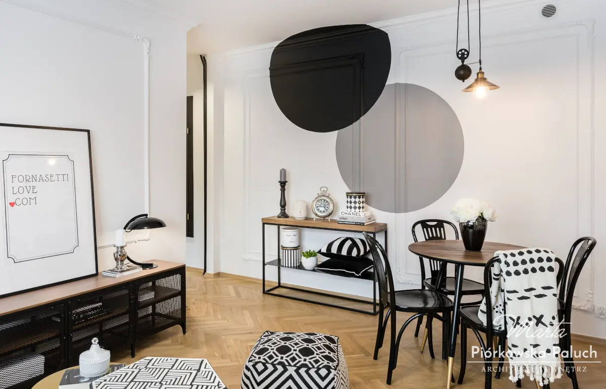 Dostrzegalny żart i „przymrużenie oka” w podejściu do wystroju dodaje aranżacji charakteru i lekkości. Uosobieniem robiącej wrażenie zabawy są między innymi wielkie twarze śpiewaczki operowej, której Fornasetti dał nieśmiertelną sławę zdobiąc swoje projekty jej wizerunkiem. Ta niemalże obsesja inspiruje po dzień dzisiejszy, sprawiając że powstają tak wyjątkowe projekty jak ten. Ciekawym elementem magicznego świata, do którego wprowadza nas architektka Marta Piórkowska – Paluch są namalowane na ścianie niesymetryczne koła, odczarowujące klasyczny sznyt sztukaterii.