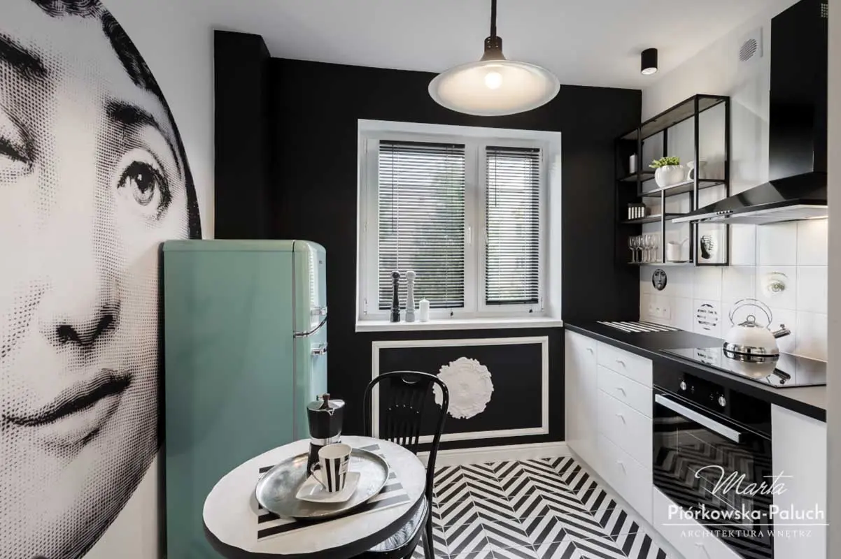 Jedynym barwnym elementem w całym projekcie jest miętowa lodówka w retro klimacie. Przełamuje ona czarno – białą konwencję i sprawia, że projekt kuchni staje się subtelniejszy. Pastelowa lodówka na tle dużej twarzy muzy Fornasettiego – Liny Cavalieri wygląda zarazem świeżo i kobieco. W opozycji do tego magicznego zakątka staje zabudowa kuchenna sympatyzująca ze stylem loftowym. O jedności stylistycznej obu stref decydują płytki na ścianie nad blatem, w które są wkomponowane różne oblicza największej muzy wszech czasów, której wizerunek stał się jednym z najpopularniejszych motywów dekoracyjnych świata.