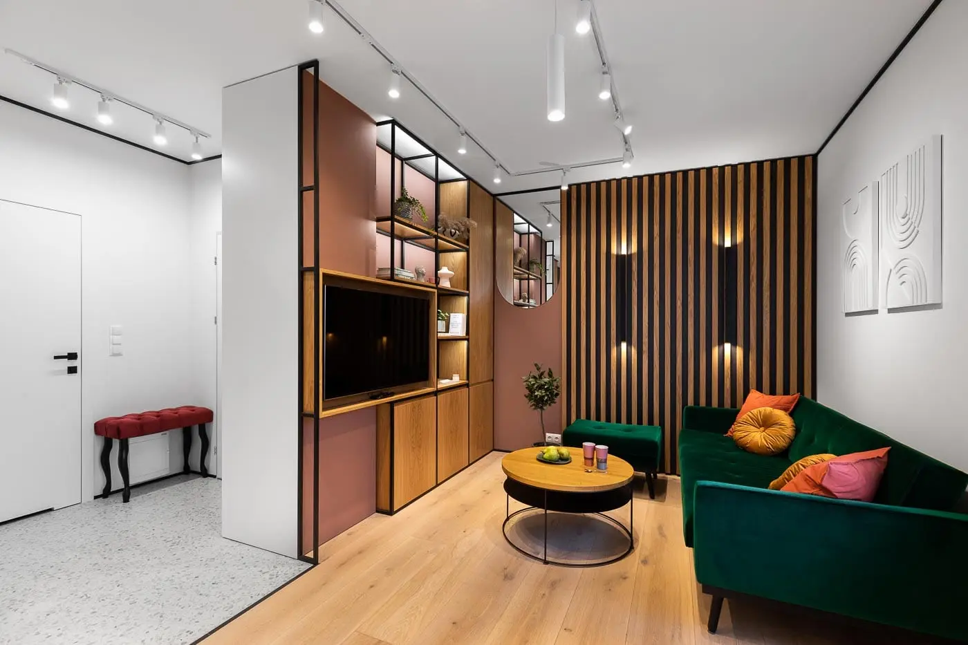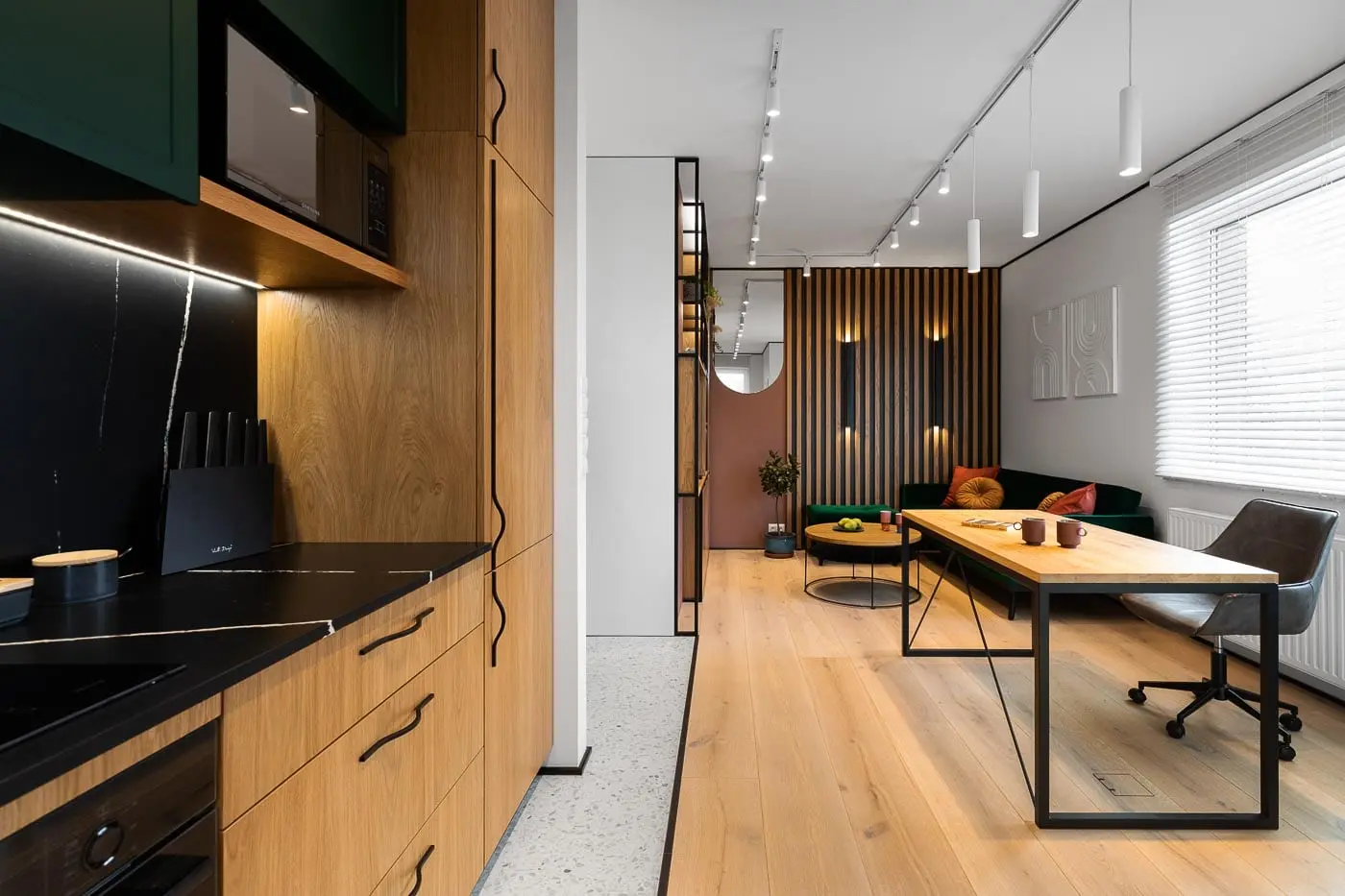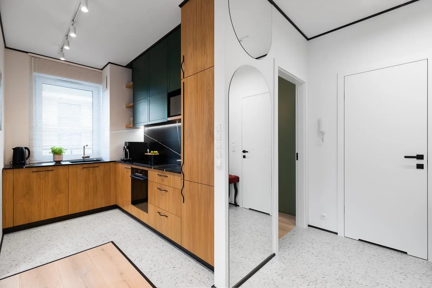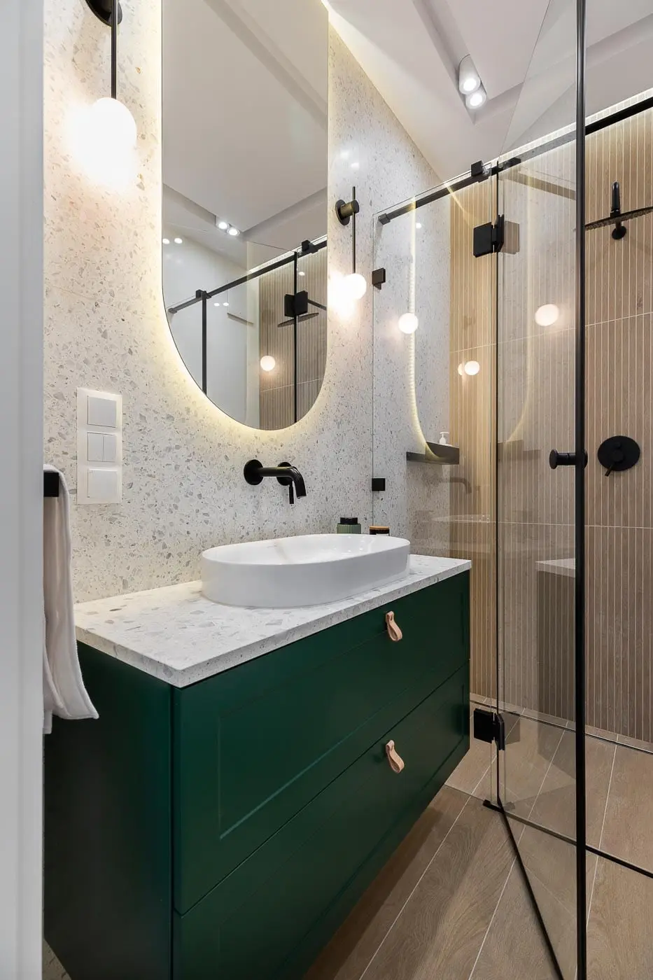O charakterze wnętrza stanowią piękne i szlachetne materiały, takie jak dębowy fornir, lastryko, czarny spiek, czy szczotkowana i bielona deska podłogowa, a także dekoracyjne oświetlenie liniowe i odważne motywy kolorystyczne. Lustro o półowalnym kształcie pojawia się w całym mieszkaniu powiększając optycznie przestrzeń i dodając ciekawych efektów, natomiast elementy, takie jak ławka na „ludwikowskich” nóżkach, butelkowa zieleń sofy, czy ruda tapicerka wezgłowia łóżka czynią wnętrze eklektycznym i przytulnym.