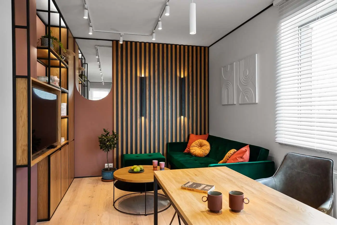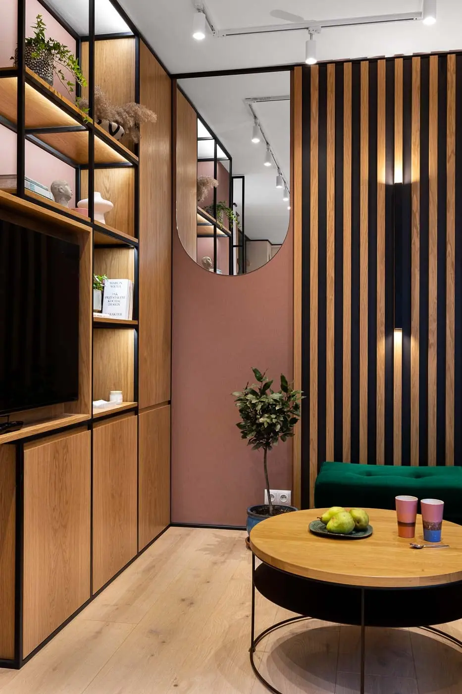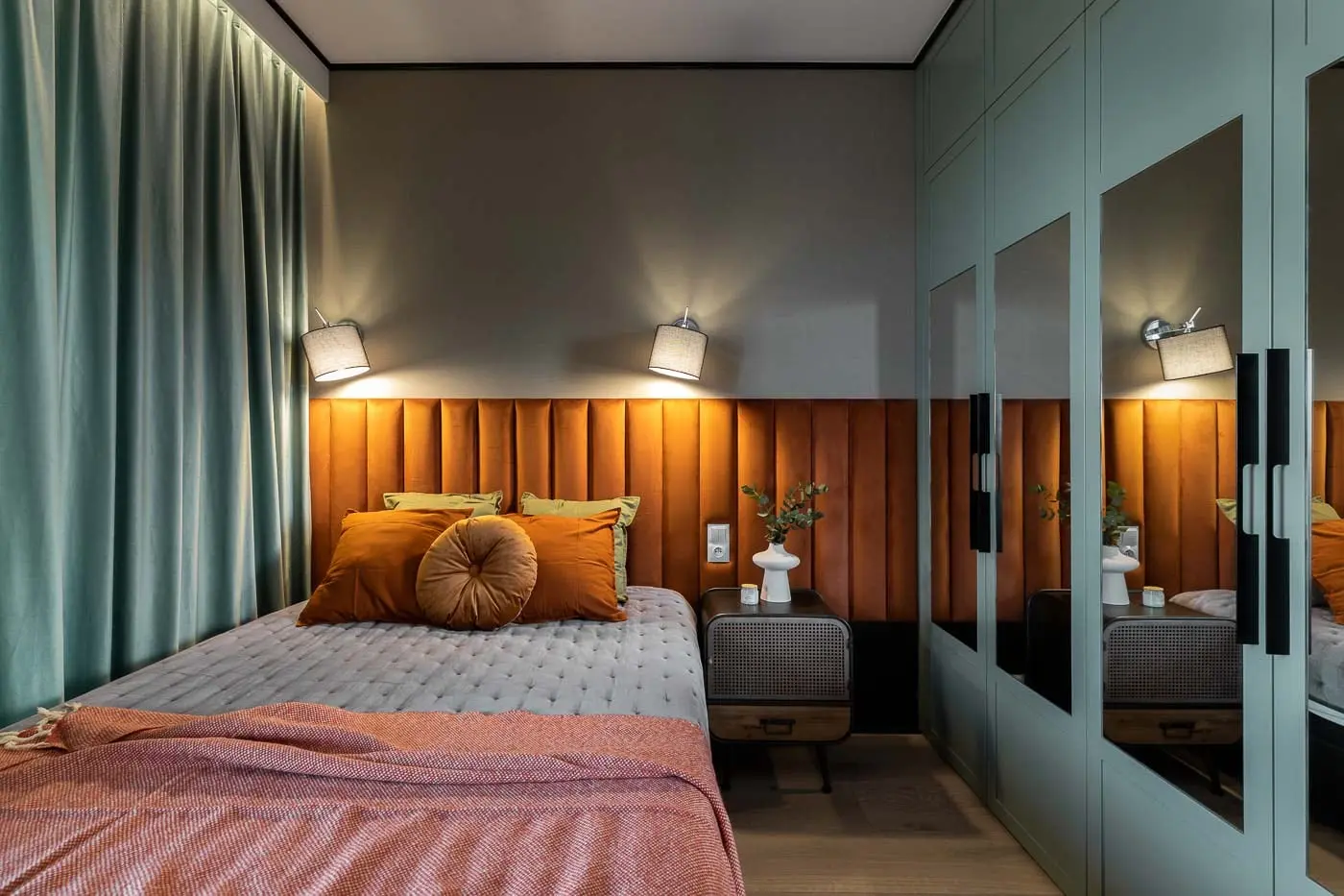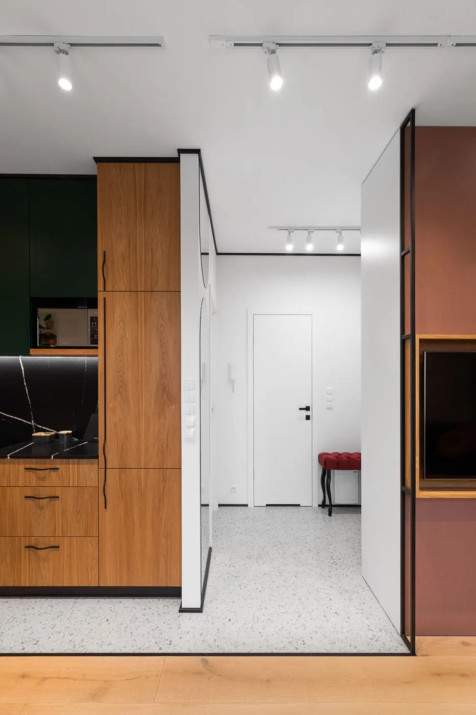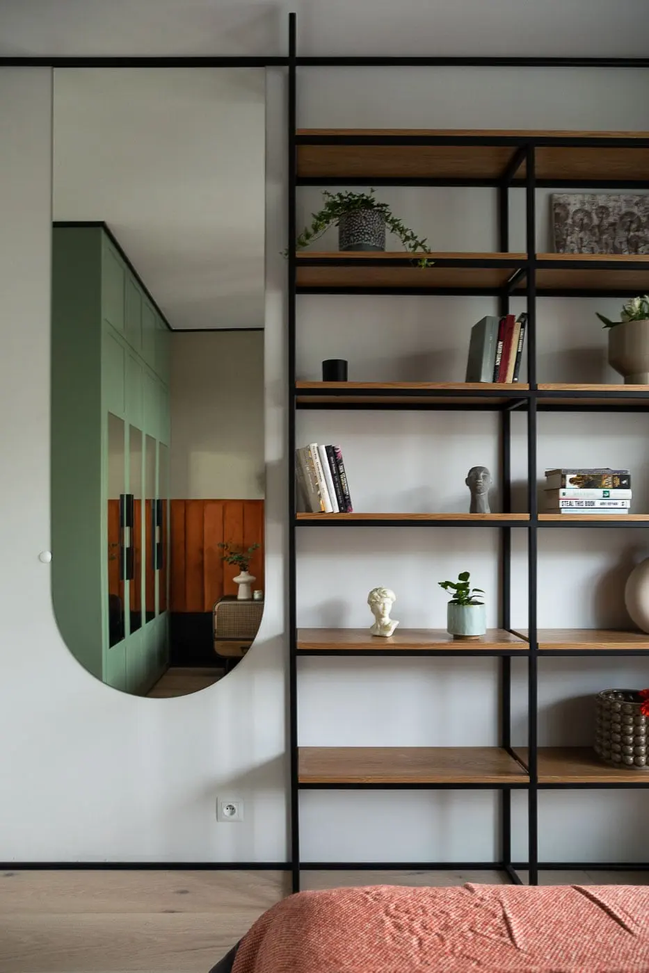 O charakterze wnętrza stanowią piękne i szlachetne materiały, takie jak dębowy fornir, lastryko, czarny spiek, czy szczotkowana i bielona deska podłogowa, a także dekoracyjne oświetlenie liniowe i odważne motywy kolorystyczne. Lustro o półowalnym kształcie pojawia się w całym mieszkaniu powiększając optycznie przestrzeń i dodając ciekawych efektów, natomiast elementy, takie jak ławka na „ludwikowskich” nóżkach, butelkowa zieleń sofy, czy ruda tapicerka wezgłowia łóżka czynią wnętrze eklektycznym i przytulnym.