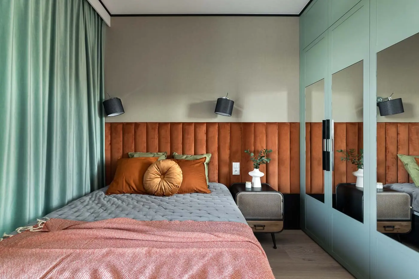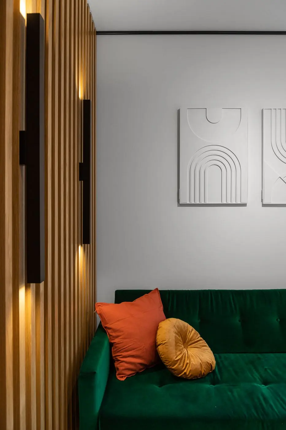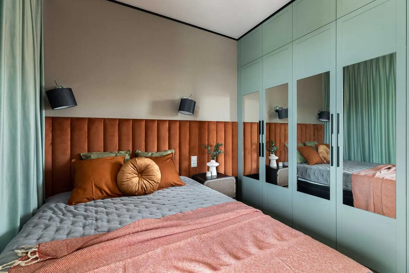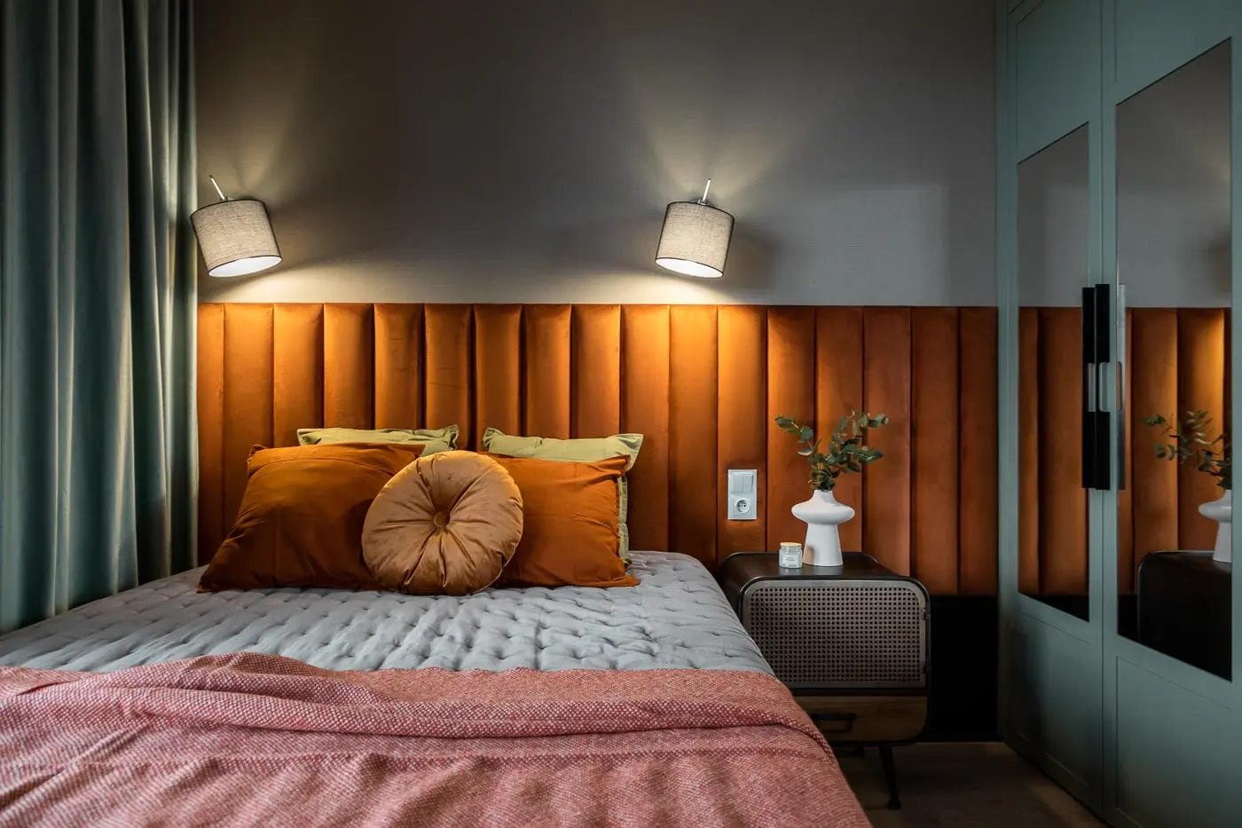 O charakterze wnętrza stanowią piękne i szlachetne materiały, takie jak dębowy fornir, lastryko, czarny spiek, czy szczotkowana i bielona deska podłogowa, a także dekoracyjne oświetlenie liniowe i odważne motywy kolorystyczne. Lustro o półowalnym kształcie pojawia się w całym mieszkaniu powiększając optycznie przestrzeń i dodając ciekawych efektów, natomiast elementy, takie jak ławka na „ludwikowskich” nóżkach, butelkowa zieleń sofy, czy ruda tapicerka wezgłowia łóżka czynią wnętrze eklektycznym i przytulnym.