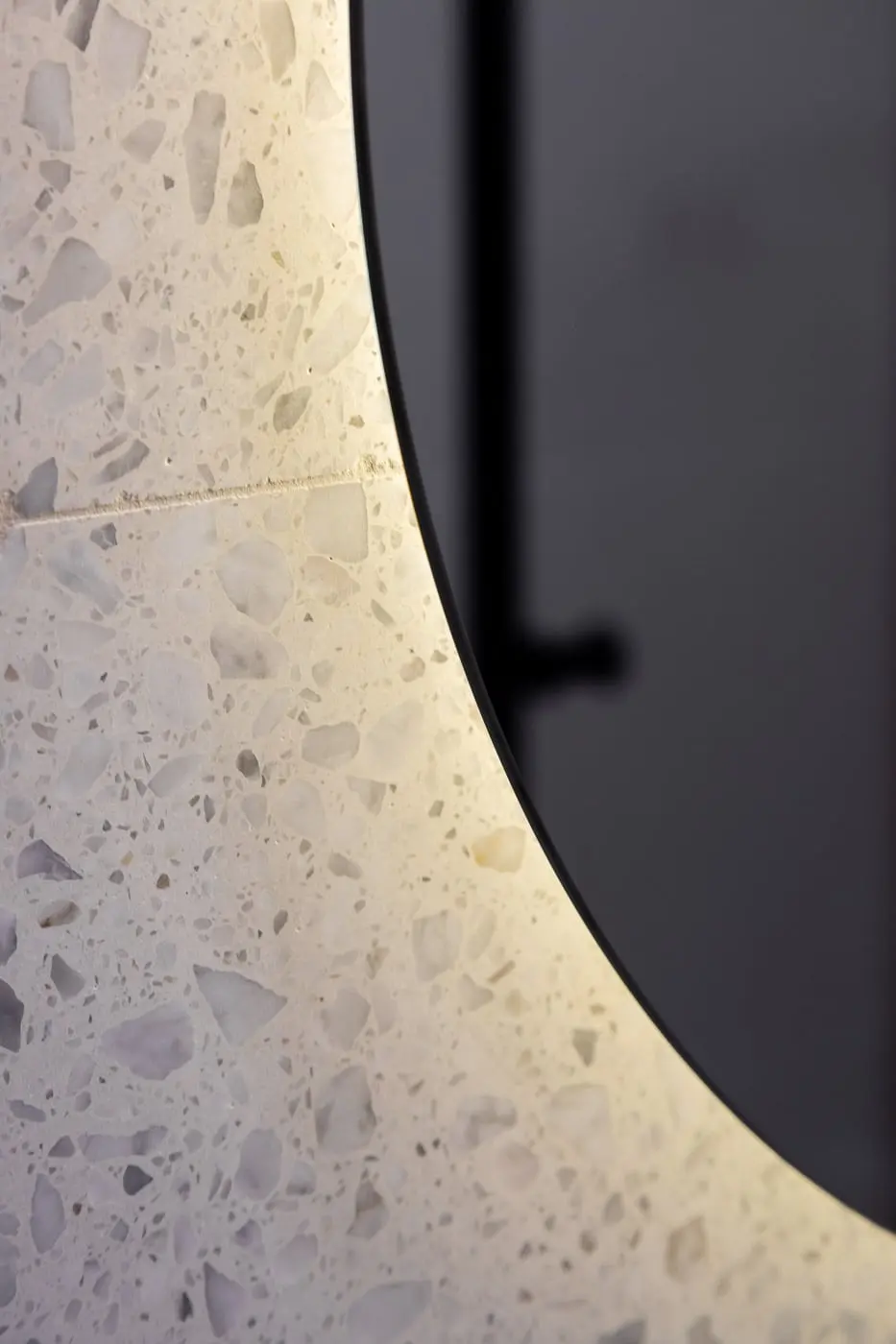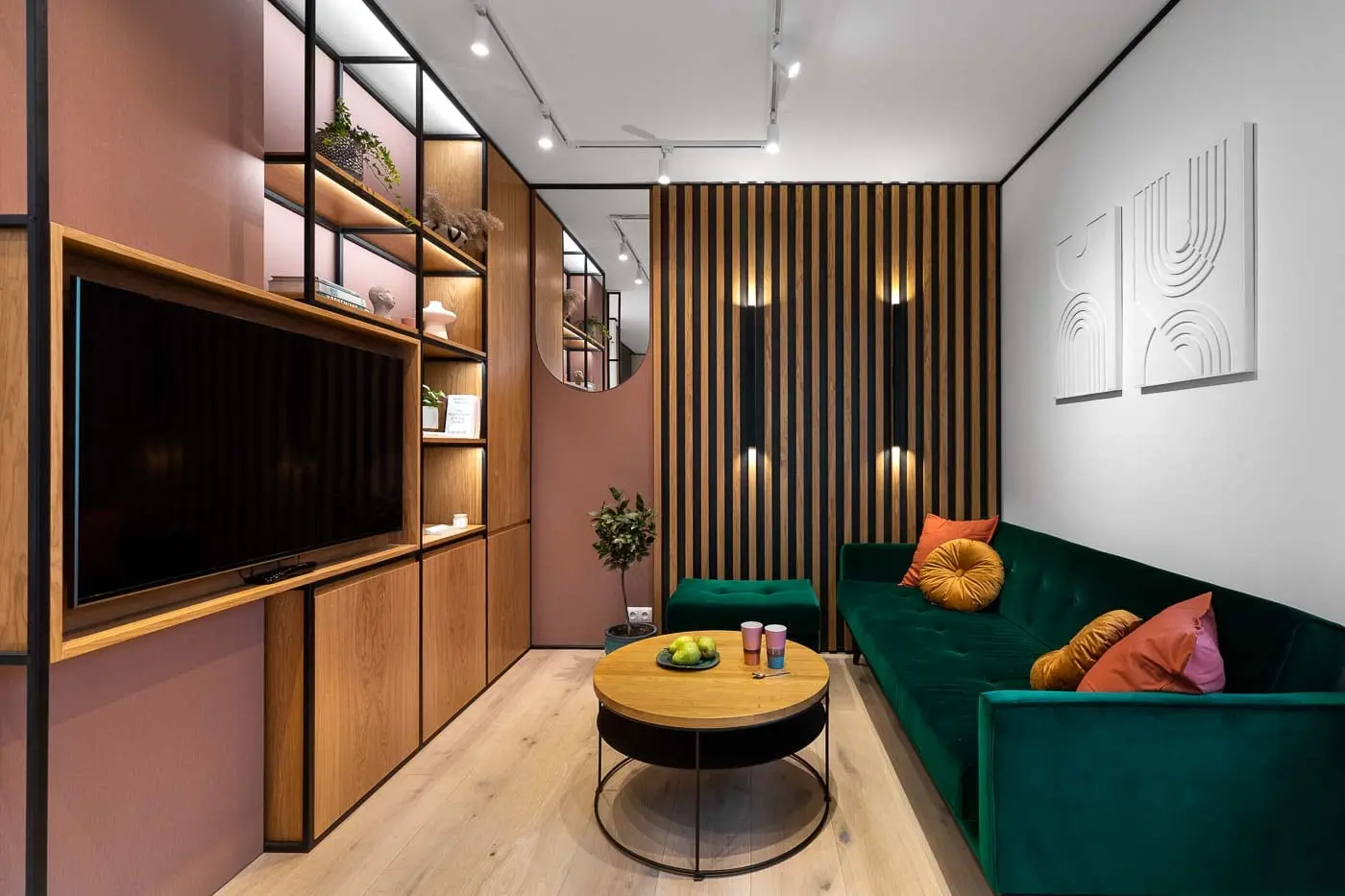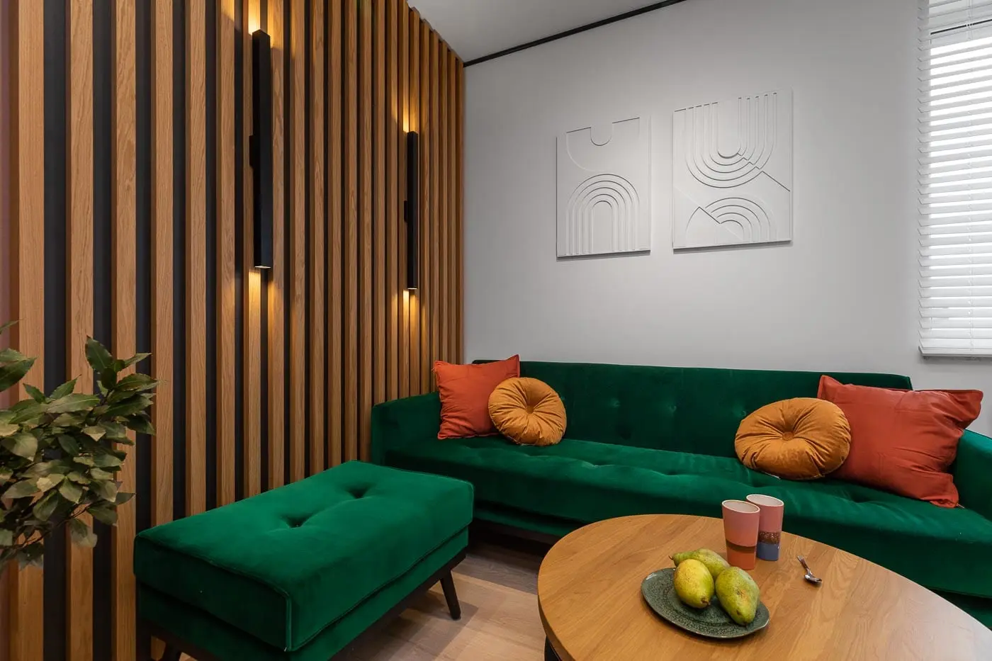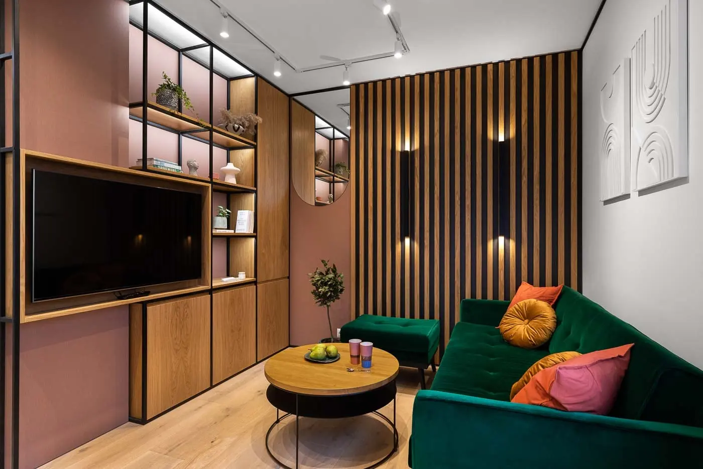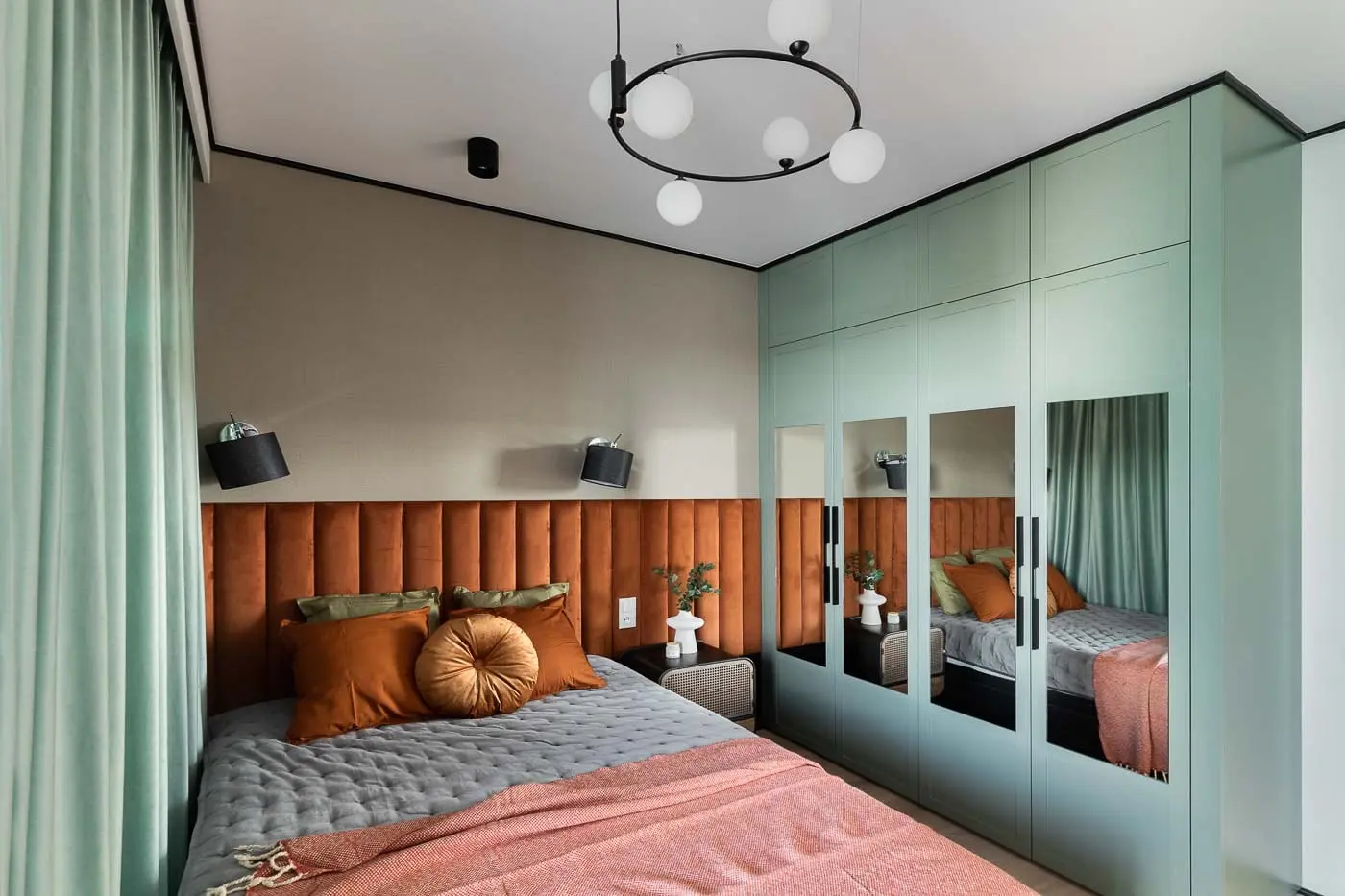 O charakterze wnętrza stanowią piękne i szlachetne materiały, takie jak dębowy fornir, lastryko, czarny spiek, czy szczotkowana i bielona deska podłogowa, a także dekoracyjne oświetlenie liniowe i odważne motywy kolorystyczne. Lustro o półowalnym kształcie pojawia się w całym mieszkaniu powiększając optycznie przestrzeń i dodając ciekawych efektów, natomiast elementy, takie jak ławka na „ludwikowskich” nóżkach, butelkowa zieleń sofy, czy ruda tapicerka wezgłowia łóżka czynią wnętrze eklektycznym i przytulnym.