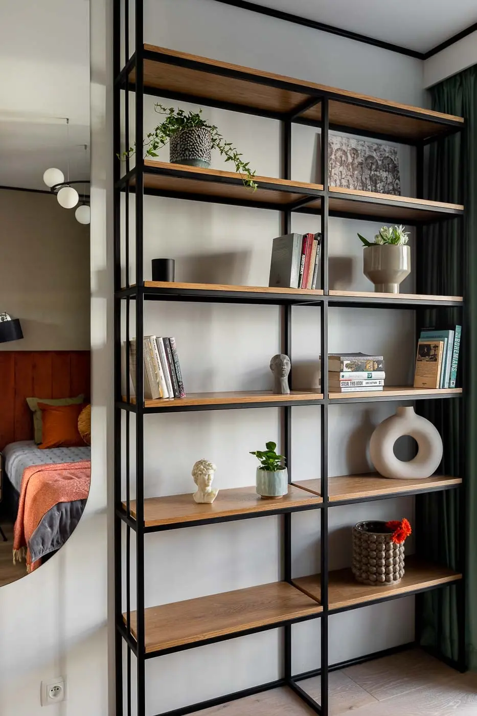 Mała sypialnia pomieściła obszerną szafę z lustrami i pojemny regał na książki.