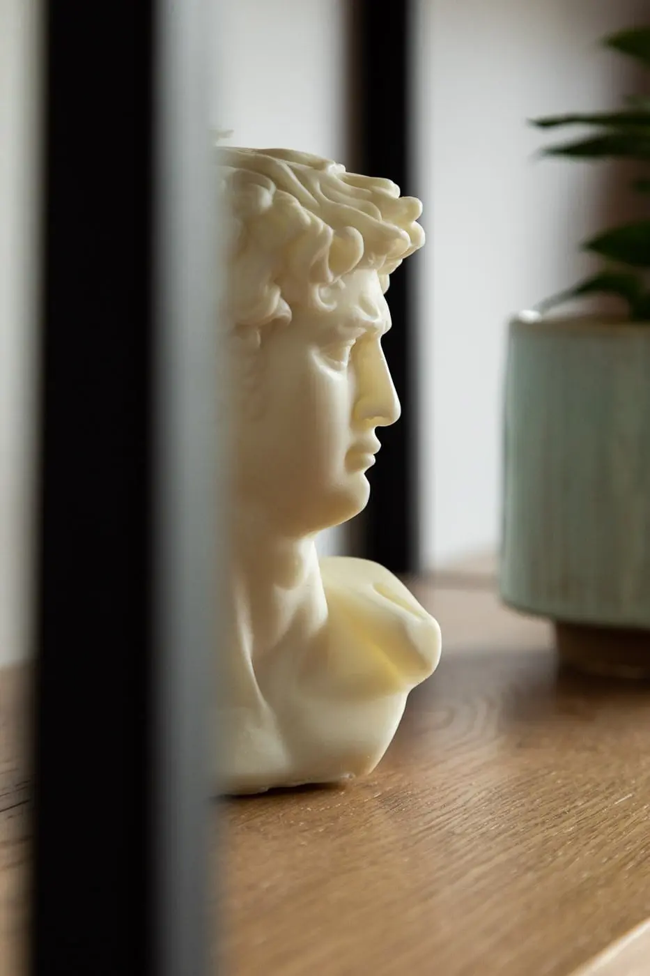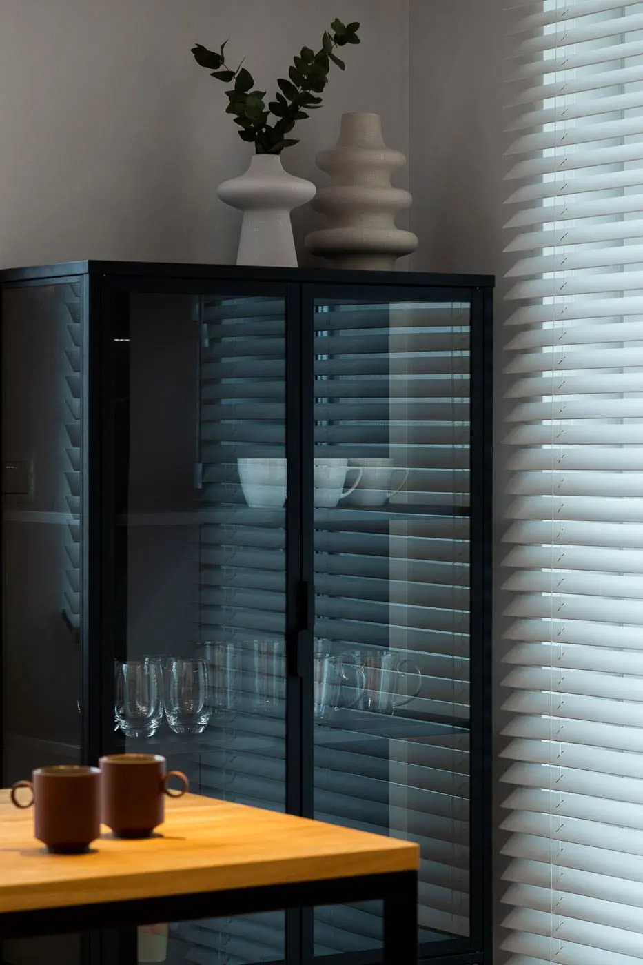 Ważnym elementem stylistycznym wnętrza jest motyw czarnej linii, która graficznym konturem obrysowuje sufit, a także posadzkę tworząc listwę przypodłogową, czy oddzielając deskę od gresu. Czarna linia w formie stalowego profilu stanowi konstrukcję regałów oraz pojawia się jako uchwyt meblowy.