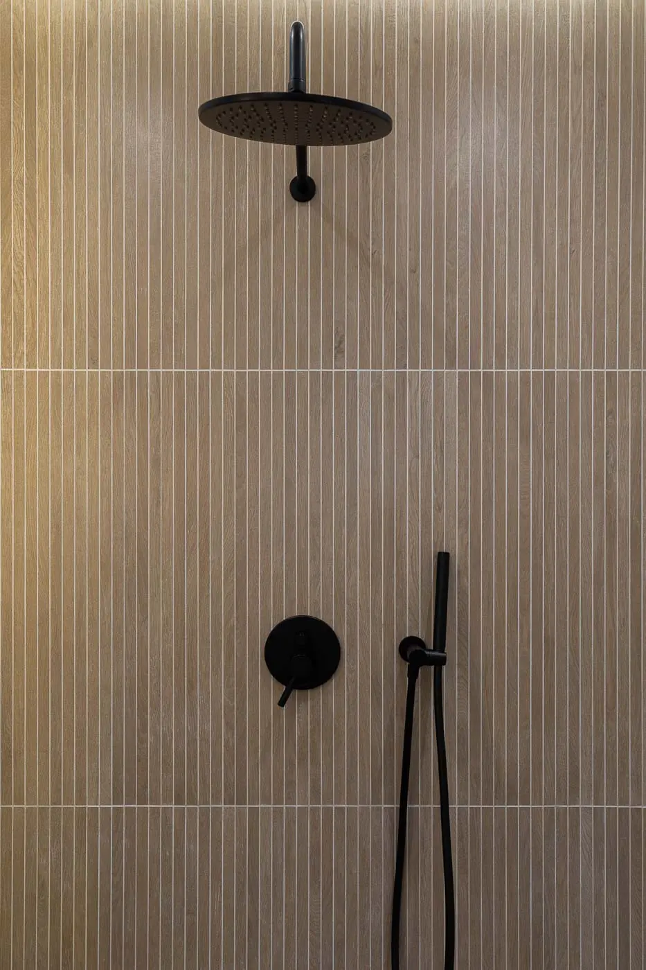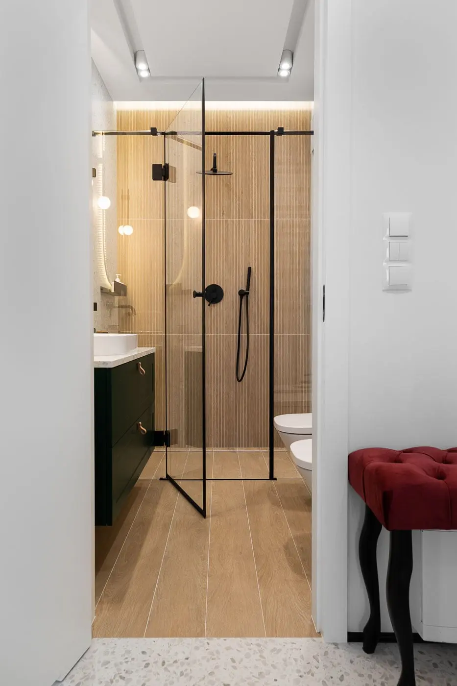 W łazience oprócz sporej szafki umywalkowej i miski wc znalazło się miejsce na bidet i dużą kabinę prysznicową. Tu również zdecydowano się na położenie szarego lastryko, które ciekawie kontrastuje z płytkami drewnopodobnymi. Charakteru dodaje armatura w kolorze czerni.