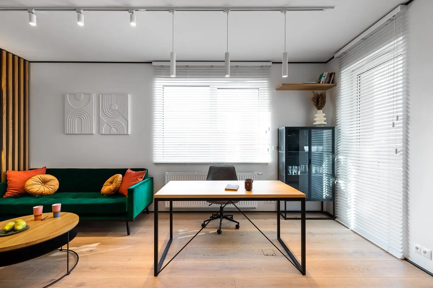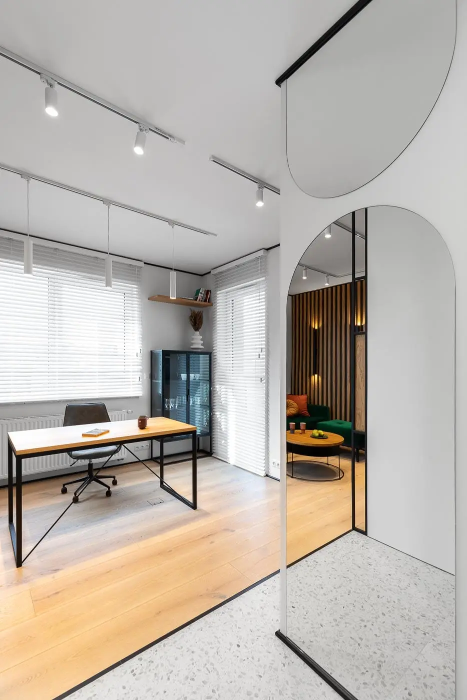 Projekt tego niewielkiego mieszkania był ciekawym wyzwaniem od samego początku dla architektki Anny Kuźnik ze Studia KU, głównie ze względu na nietypową funkcję, jaką miało ono pełnić oraz upodobanie inwestorów do odważnych i niebanalnych zabiegów stylistycznych. Mieszkanie o łącznej powierzchni 39 m2 miało stanowić dla p. Krzysztofa biuro, ale z zachowaniem charakteru mieszkania, czyli swoisty home office, ale z możliwością oddzielenia pracy i domu. Na ten moment lokal stanowi miejsce pracy i spotkań biznesowych, ale w przyszłości wymiana biurka na stół jadalniany uczyni przestrzeń w pełni mieszkalną.