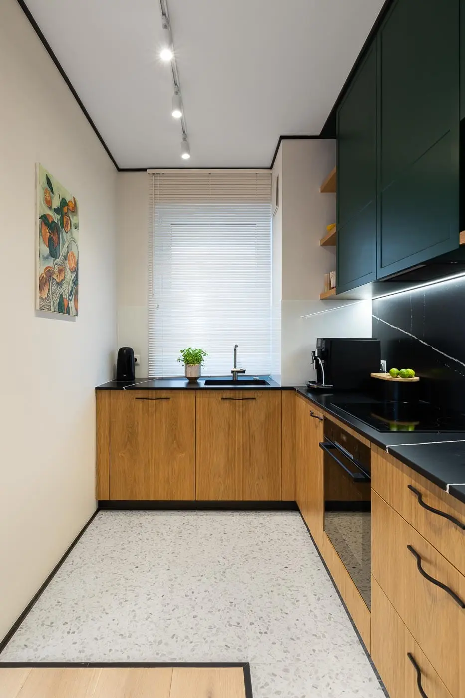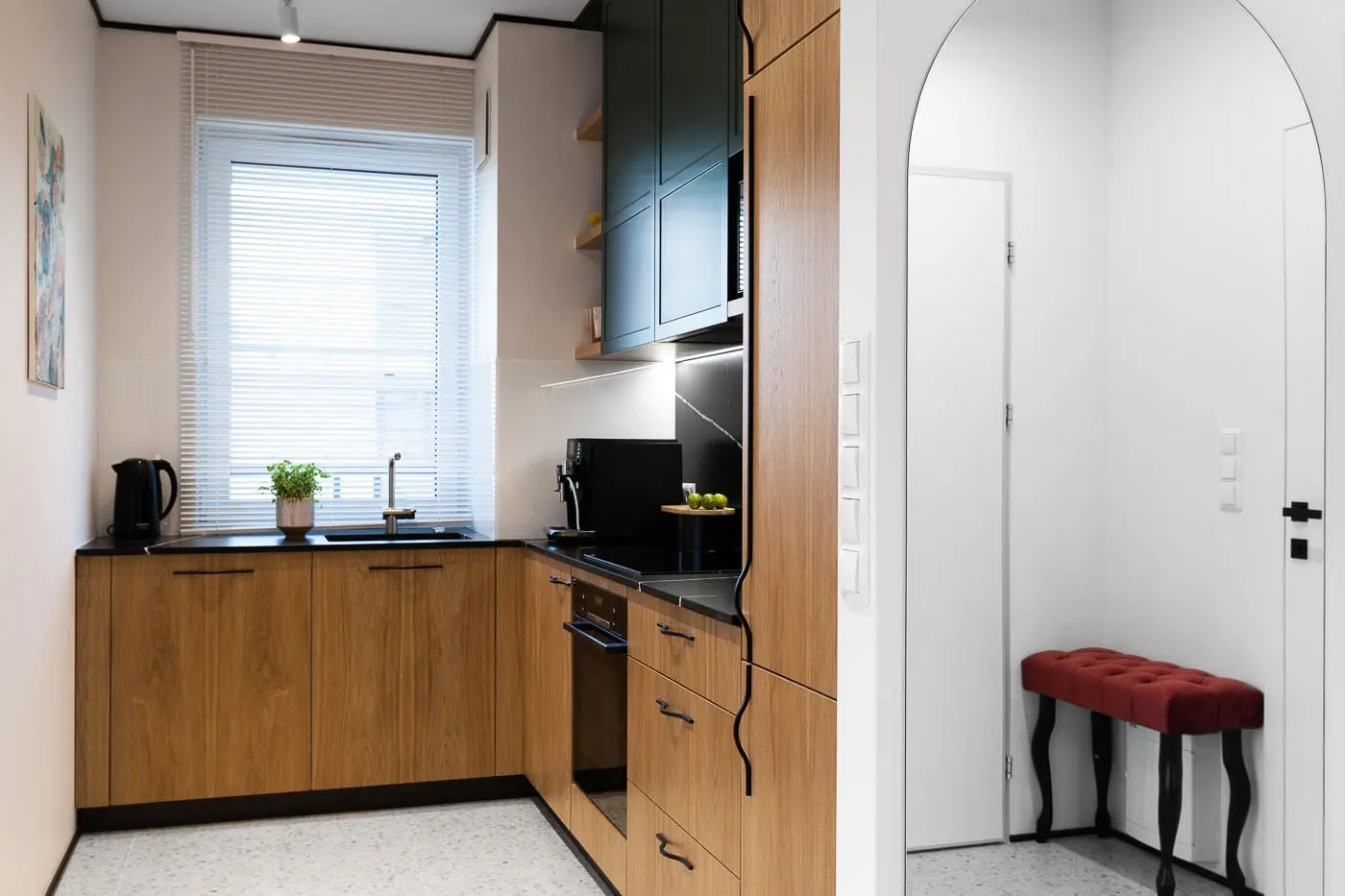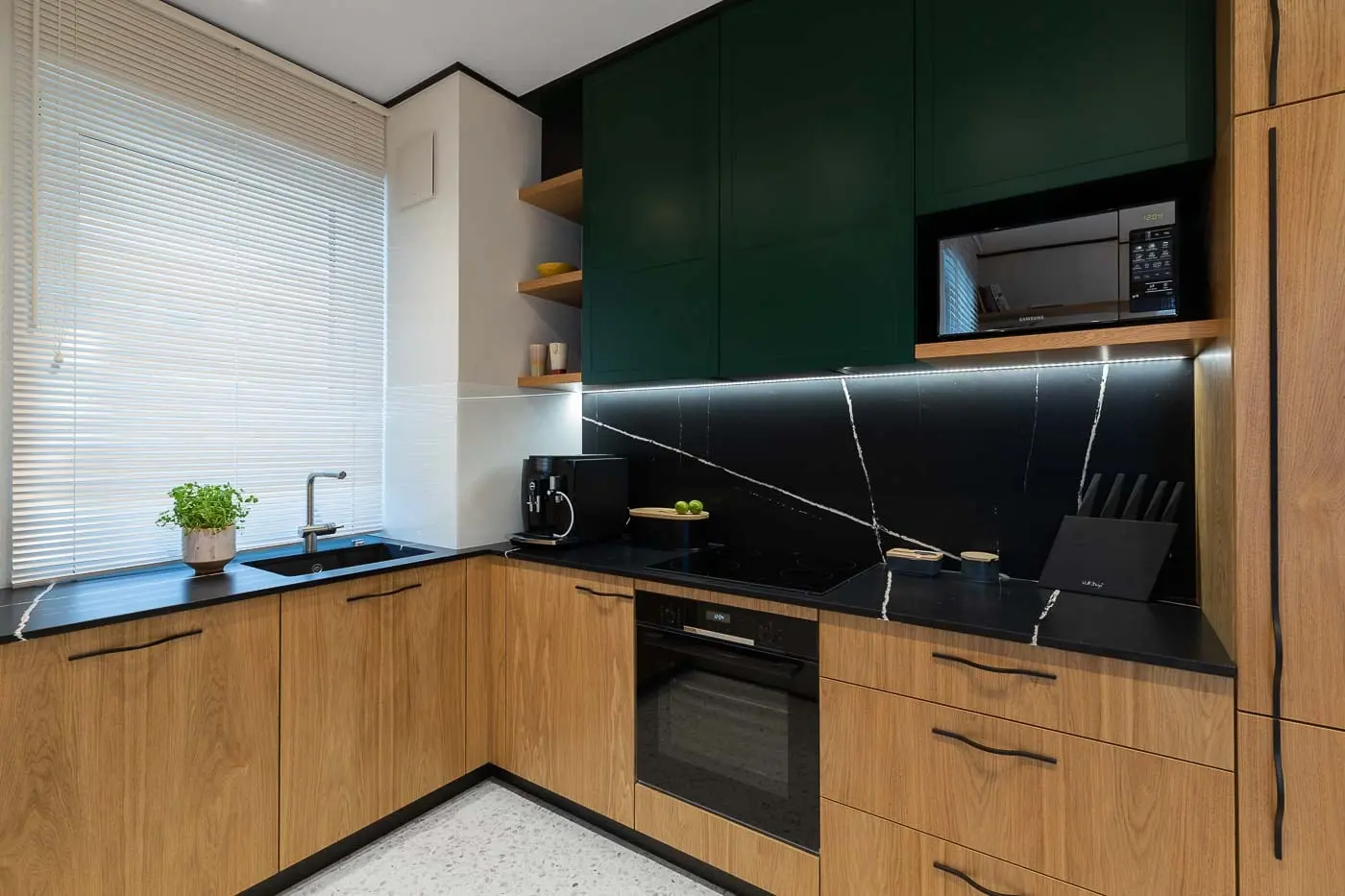Ciekawym i ponadczasowym zestawieniem jest wybór drewnianych mebli oraz czarnych dodatków do kuchni. Ten duet zawsze ze sobą dobrze współgra i gwarantuje udaną aranżację, która nie znudzi nam się po latach. Na podłogę w kuchni wybrano jasno szare płytki lastryko. Pod oknem zdecydowano się na umieszczenie zlewu.