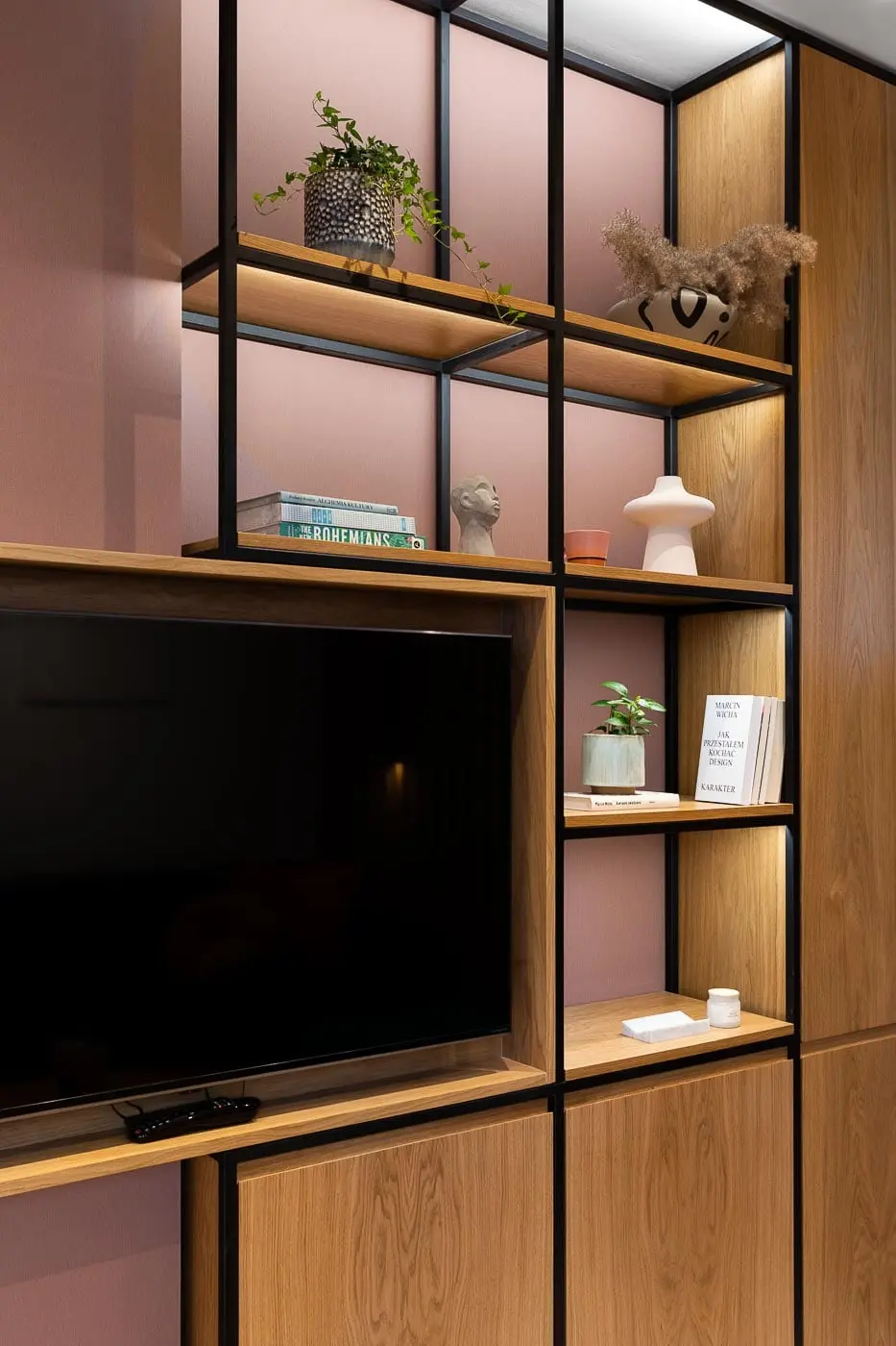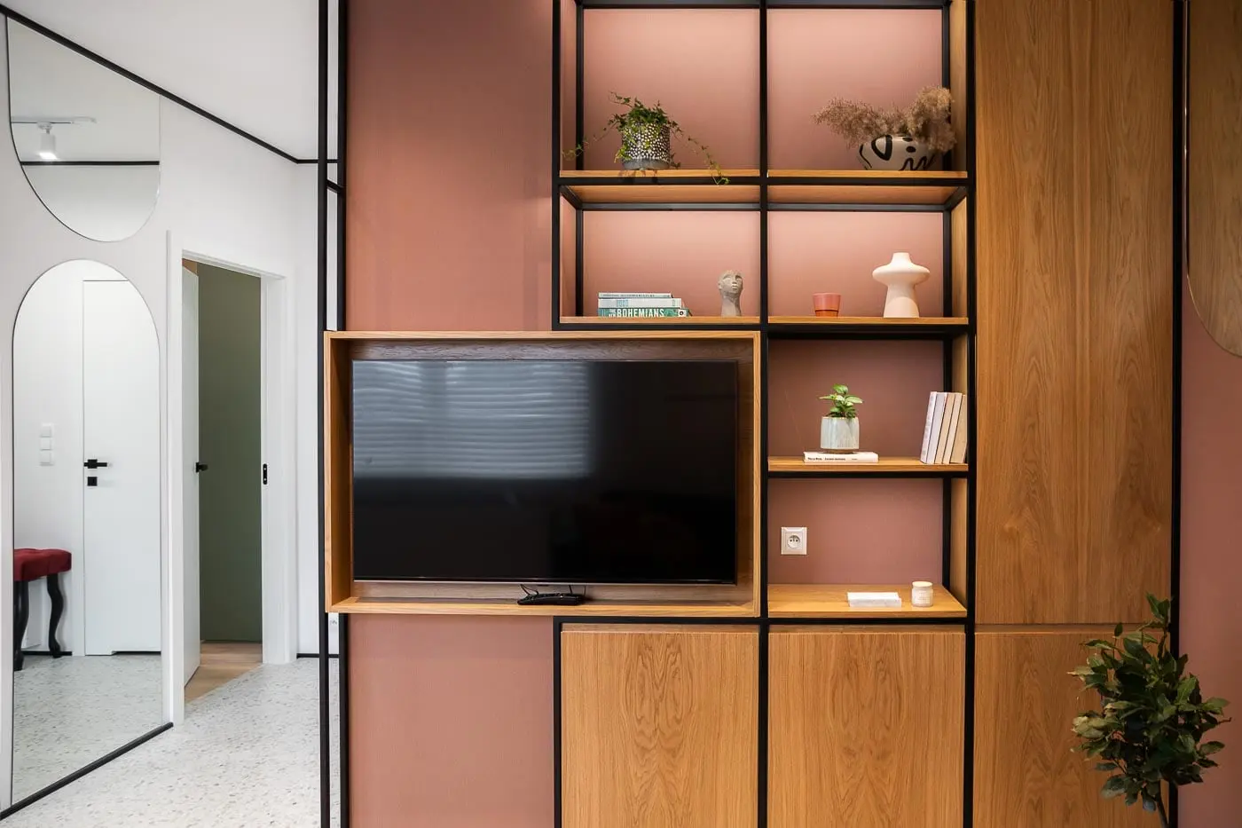 Dzięki odpowiednim ruchom na etapie projektowania układu funkcjonalnego na niedużym metrażu udało się pomieścić wiele z pełnym zachowaniem ergonomii. Natomiast dzięki likwidacji ścianki działowej przy drzwiach wejściowych i zintegrowaniu zabudowy meblowej strefy dziennej i holu, uzyskana została, zarówno wysoka zabudowa na odzież wierzchnią, jak i przestrzeń na telewizor, sprzęt rtv i przechowywanie biurowe.