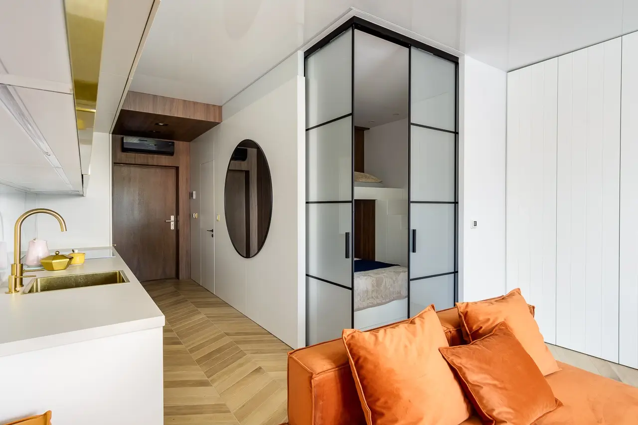 Kolejnym istotnym punktem wśród wytycznych inwestorów było wydzielenie sypialni, co na 39m2 nie było łatwym zadaniem. Zespół Musta2 wpadł na bardzo ciekawy pomysł przedłużenia ściany korytarza i stworzenie niewielkiego kubika z przesuwnymi drzwiami. Wewnątrz umieszczono podwójne łóżko, a nad nim „antresolę” z miejscem do spania dla dziecka. W ciągu dnia można rozsunąć drzwi, co optycznie powiększa przestrzeń. Natomiast w razie potrzeby, powstaje przytulna sypialnia, oddzielona od reszty mieszkania.