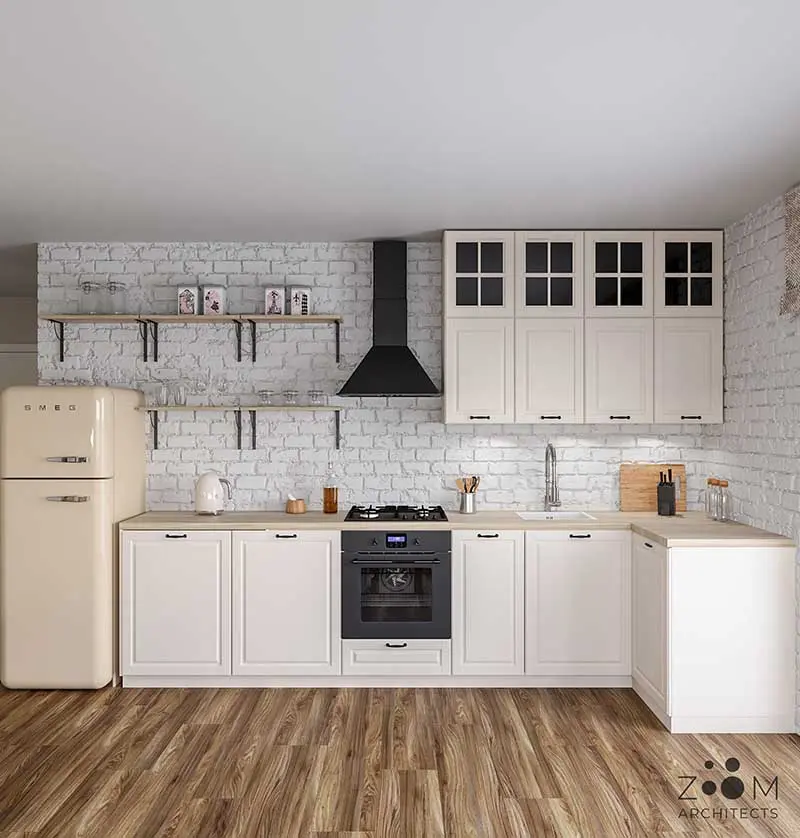 W kuchni na ścianie nad blatem zdecydowano się na pozostawienie cegieł lecz pomalowano je na biało, co dodało lekkości i jasności wnętrzu. Znakomicie komponują się z białymi meblami oraz lodówką w stylu retro SMEG