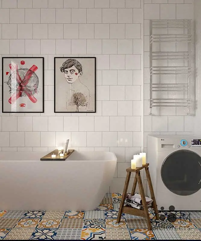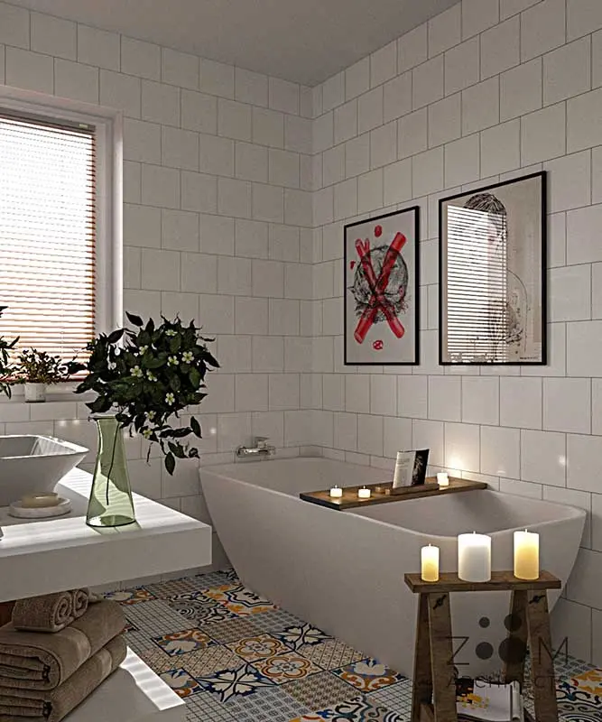 Boho łazienka to gorący trend, który sprawia że czujemy się bliżej natury. W tym projekcie architektka postawiła na kolorowe patchworkowe płytki, oczywiście nie mogło zabraknąć dużej wanny wolno stojącej. Łazienka urządzona w nastrojowym klimacie można się zrelaksować po całym dniu.