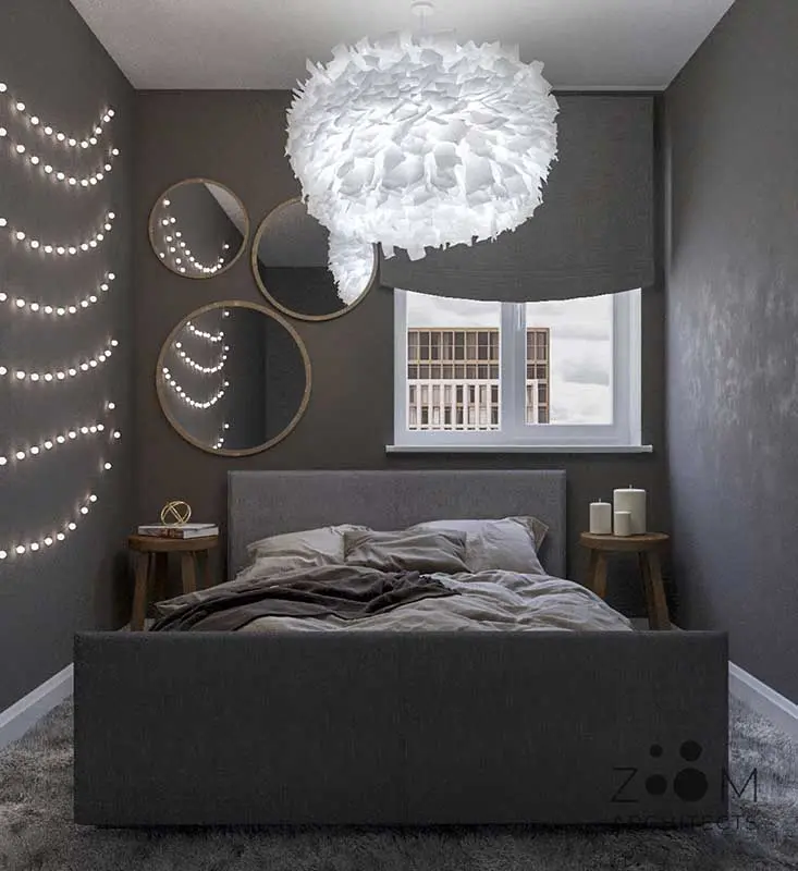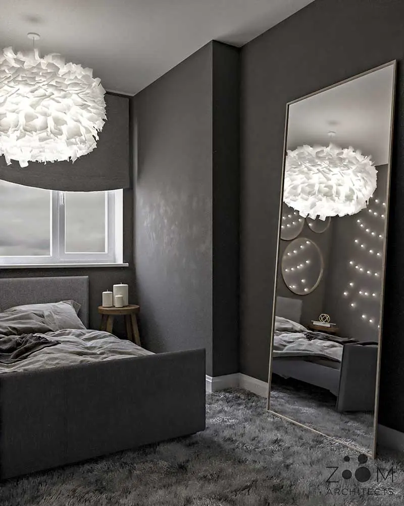 Mini sypialnia utrzymana w ciemnych szarościach. Na podłodze milutka wykładzina z długim włosiem. Wnętrze sprzyjające relaksowi i odpoczynkowi dzięki wyciszającym kolorom.
