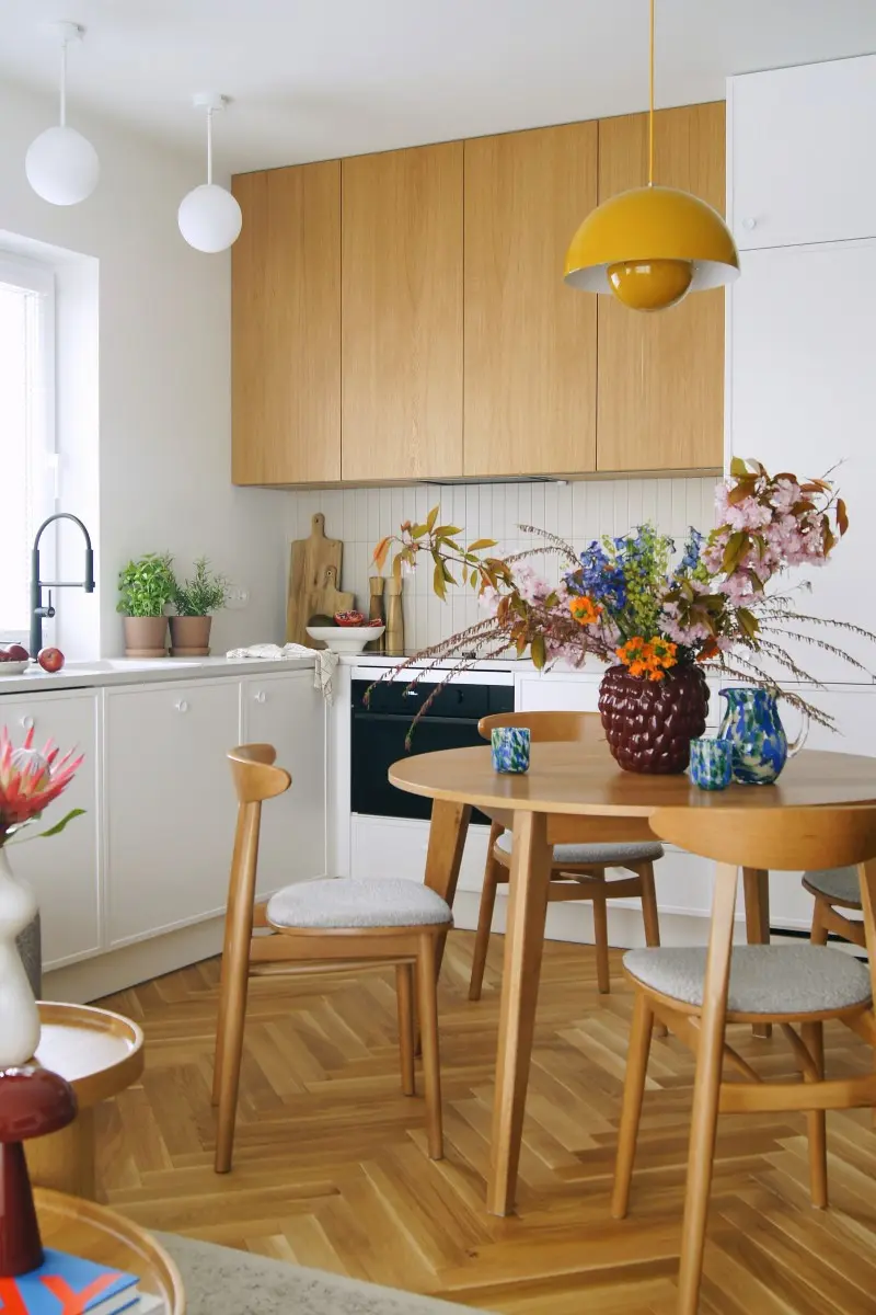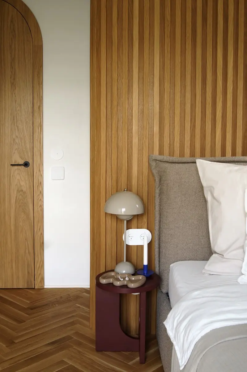 Stonowaną bazę otula wszechobecne drewno, przede wszystkim obecne na podłodze w formie klasycznej jodełki, nadające rytm wnętrzu oraz nutę francuskiej elegancji. Drewno pojawia się także w formie mebli a także na ścianach, gdzie modne lamele tworzą ciekawe zaoblenie w sypialni. Również w kuchni znajdziemy fornirowane szafki, które w połączeniu z białymi frontami i płytkami typu ,,kit kat” tworzą aranżację odporną na zmieniające się trendy i upływający czas. Dodatkowo biało – drewniana zabudowa utrzymana w minimalistycznej estetyce tworzy doskonałe tło dla życia toczącego się w otwartej strefie dziennej.