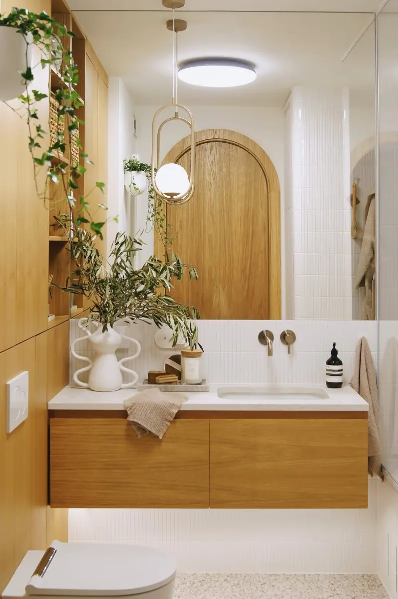Łazienka wpisuje się w klimat całego mieszkania. Jej wystrój definiuje stonowana biało – drewniana kolorystyka podkręcona delikatnym lastryko na podłodze. W ten sposób powstało idealne miejsce zarówno na szybki prysznic o poranku, jak i relaksującą kąpiel po całym dniu pracy.