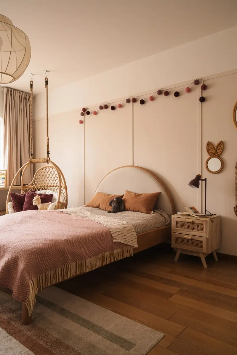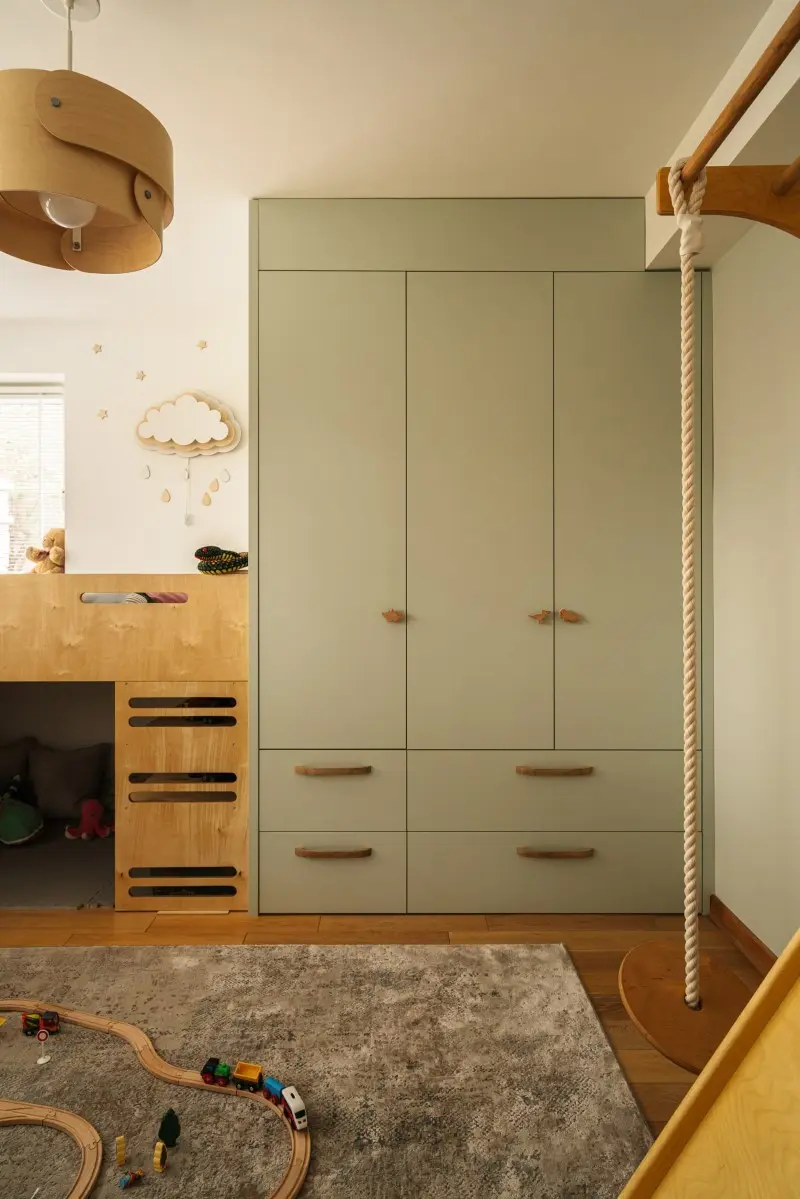 – Chciałam, żeby ta część domu była spójna z tym, co widzimy na parterze, ale jednocześnie zależało mi na jej personalizacji względem potrzeb dzieci. W każdej sypialni znajdziemy drewno, ale już zastosowana paleta kolorów dostosowana jest do poszczególnych upodobań najmłodszych mieszkańców – zdradza Hanna Pietras.