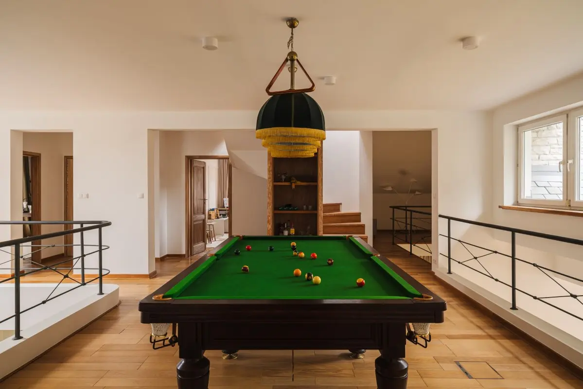 Piętro domu to część prywatna z wyjątkiem… otwartego korytarza ze stołem bilardowym, który jest ulubioną rozrywką wszystkich mieszkańców – chociaż jak sami przyznają, trudno jest im znaleźć czas na wspólną grę. Kiedy jednak miniemy go, trafiamy do właściwej strefy prywatnej z główną sypialnią, łazienkami i pokojami dzieci.