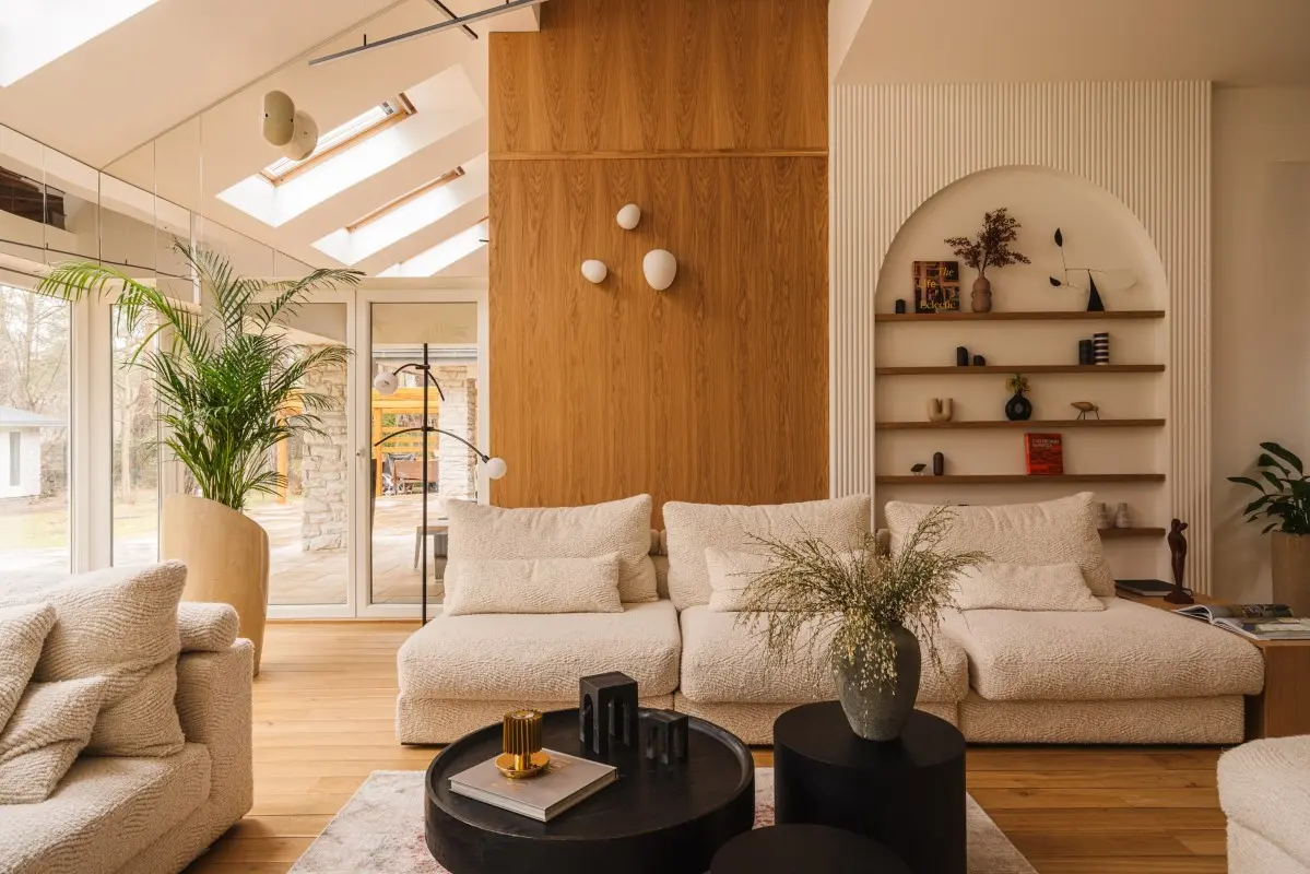 Projekt wnętrz autorstwa pracowni Hanny Pietras to nie tylko estetyka, lecz przede wszystkim historia, którą opowiada. To zaproszenie do odkrywania piękna w prostocie, doceniania natury i czerpania radości z każdego momentu spędzonego chociażby w salonie. W tym projekcie architektka skupiła się na zaprojektowaniu otwartej przestrzeni z dużymi przeszkleniami, dzięki czemu ogród przenika do wnętrza, stając się jego integralną częścią.