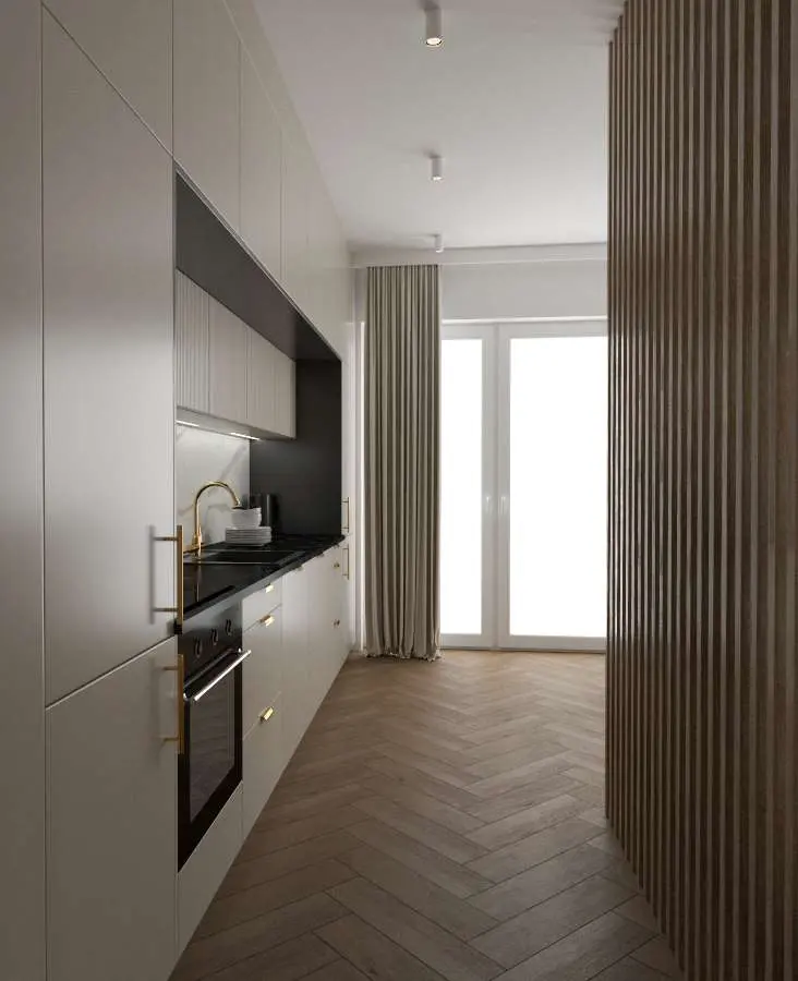 Beżowa zabudowa kuchenna znakomicie zaaranżowana jest funkcjonalna i piękna. Szafki sięgające sufitu to najlepsze rozwiązanie. Charakteru dodają tu czarne elementy jak blat kuchenny oraz znakomicie komponująca się ściana z płyty marmurowej. Blasku dodaje złota biżuteria w postacie armatury i uchwytów meblowych. Do oświetlenia tej strefy wybrano minimalistyczne lampy, które będą najlepszą dekoracją takiego wnętrza.