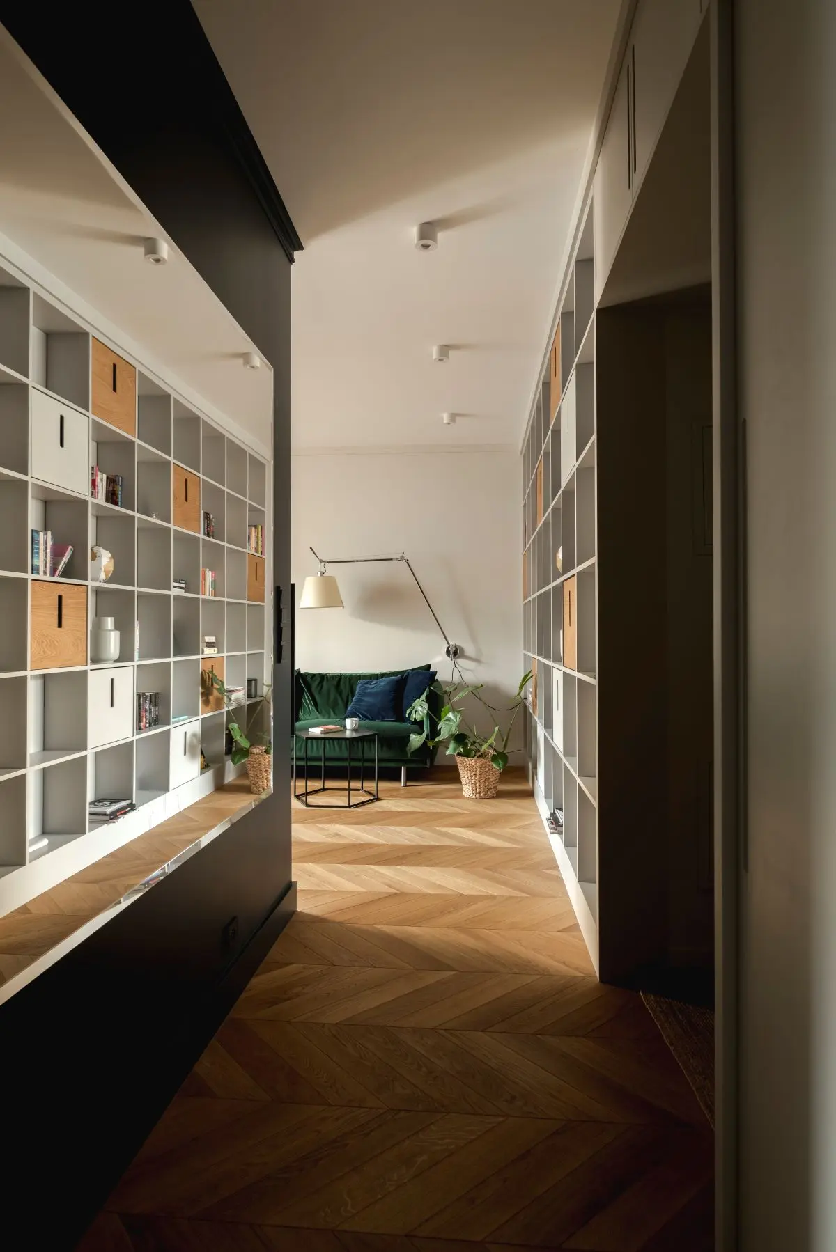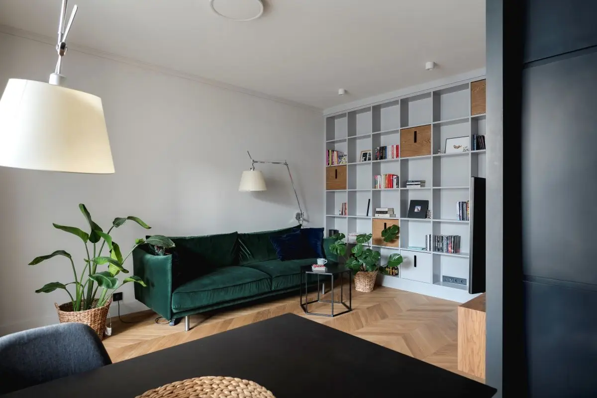 Niezwykłej przytulności całemu wnętrzu dodaję drewniana podłoga ułożona w klasyczną jodełkę. W salonie nie mogło zabraknąć wygodnej w oszałamiającym kolorze butelkowej zieleni welurowej sofy.