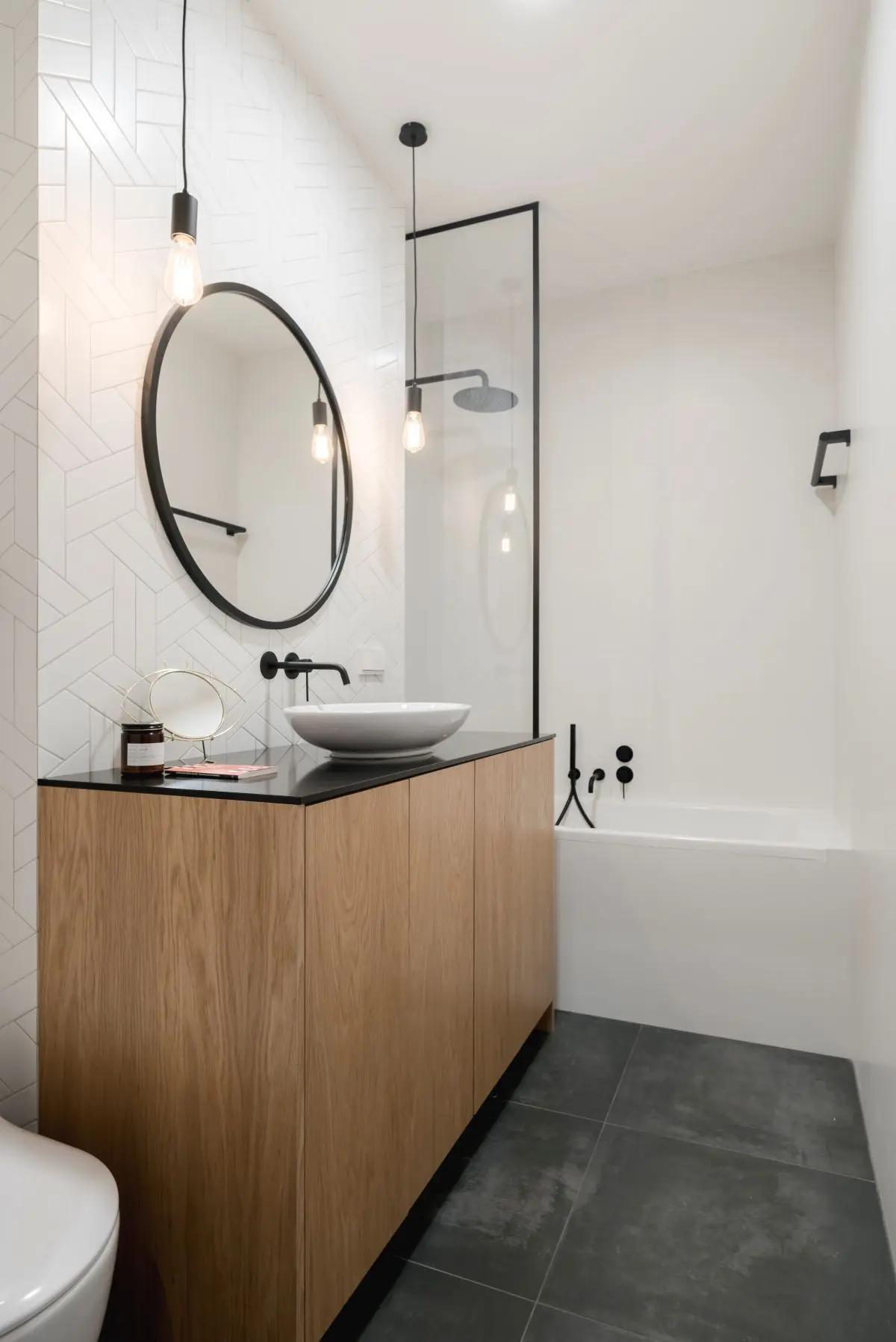 Łazienka minimalistyczna z ciekawą białą graficzną płytką na ścianie. Czarna armatura prysznicowa i umywalkowa Hushlab dopełnia całą aranżację łazienki tworząc ciekawy obraz wnętrza.