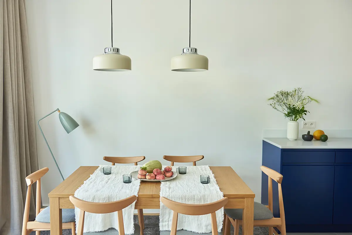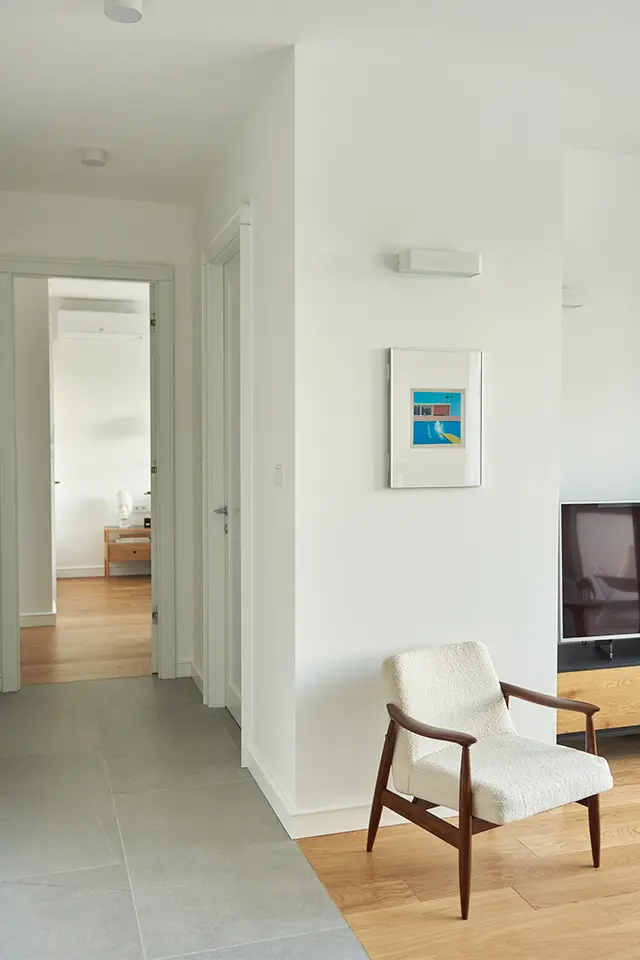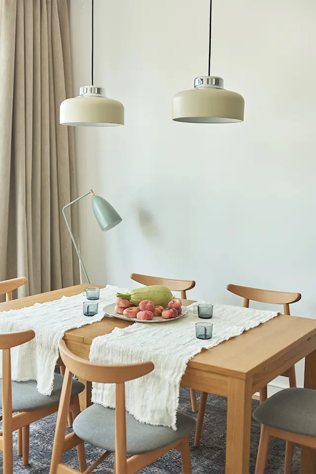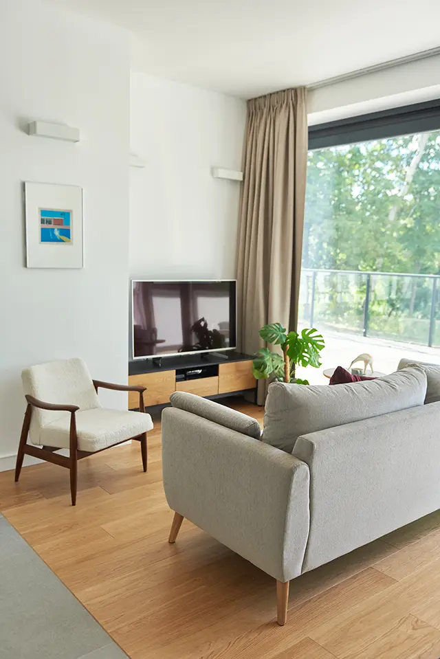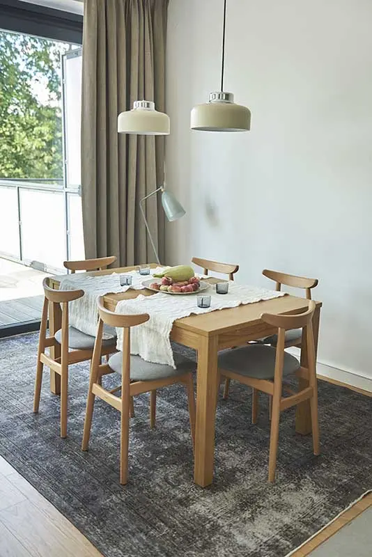 Architekta postawiła na wzornictwo z rodzimego podwórka, czyli na bukowe meble Fameg. Całość wnętrza otulone ciepłem drewnianych desek dębowych. Mieszkanie udekorowane tkaninami o grubym splocie, mosiężne dodatki w formie uchwytów dodają wnętrzu szlachetności i ducha. Salon i jadalnia to centralna część mieszkania.