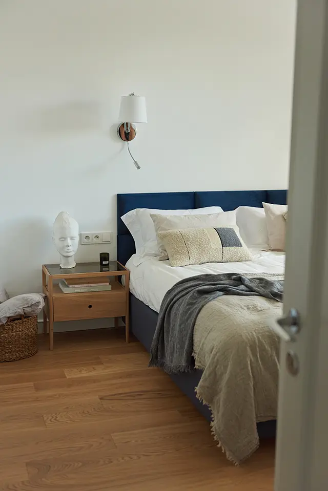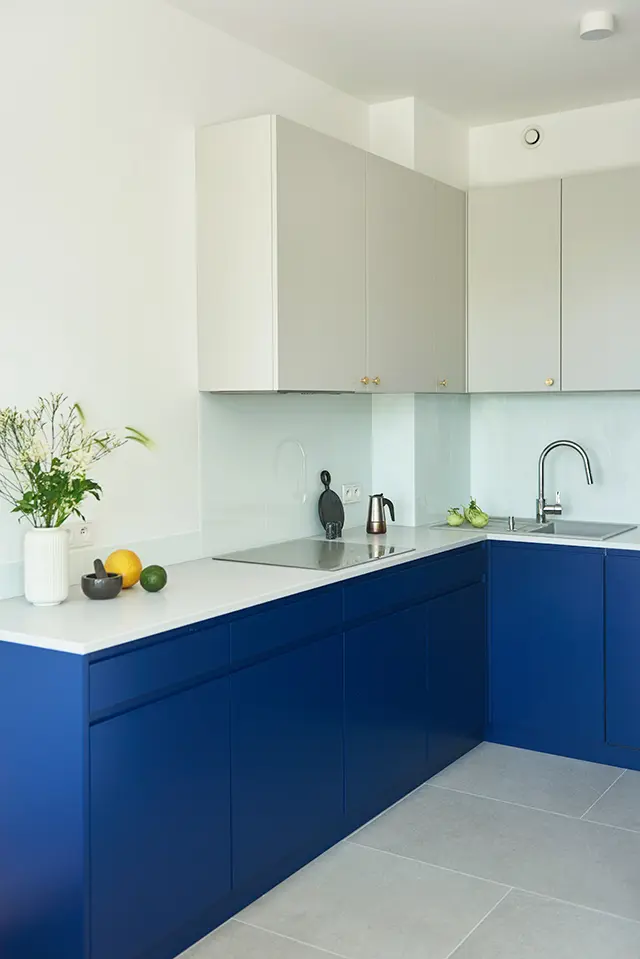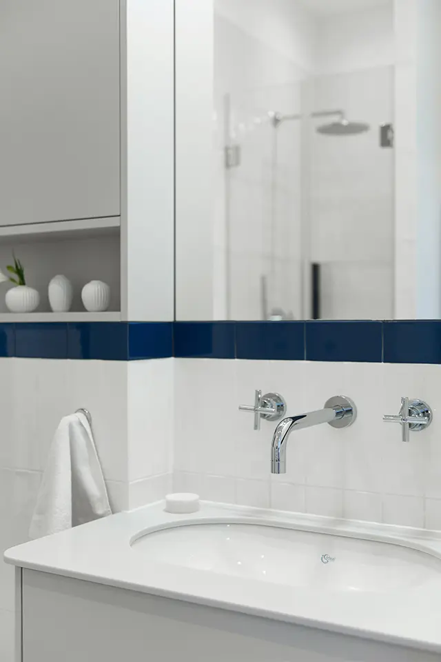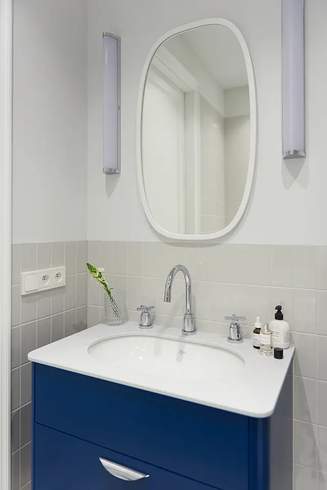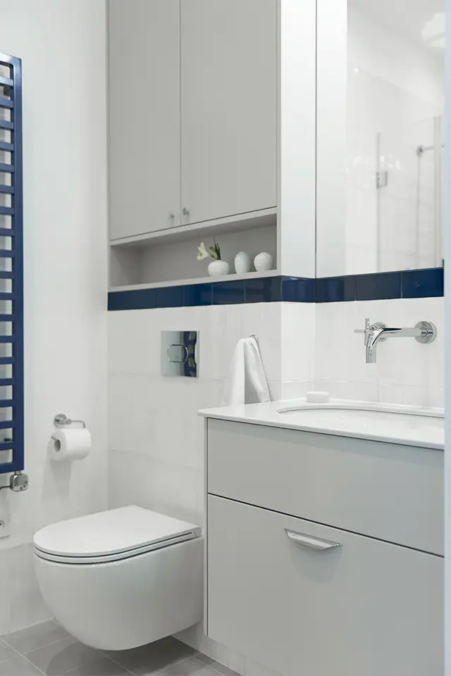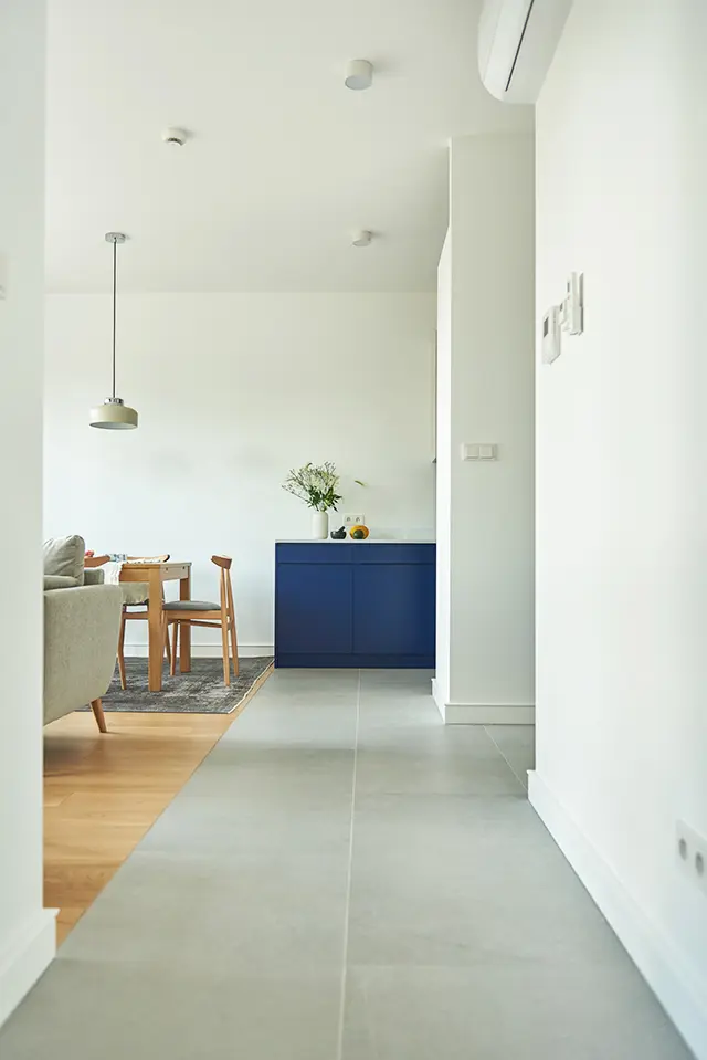 Mieszkanie znajduję się w nowoczesnym kompleksie mieszkań przy Forcie Piłsudskiego w Warszawie. Architekt Małgorzata Jaworska postawiła na stworzenie minimalistycznego, eleganckiego wnętrza w którym będzie dominować ulubiony kolor klientki. Granatowe dodatki dominują w każdym pomieszczeniu. Poprzez kobaltowe fronty szafek kuchennych, ciemno granatową glazurę w łazienkach, grzejniku wykonanym na zamówienie i welurowym zagłówku nad łóżkiem, klimat mieszkania przypomina śródziemnomorskie wybrzeże.