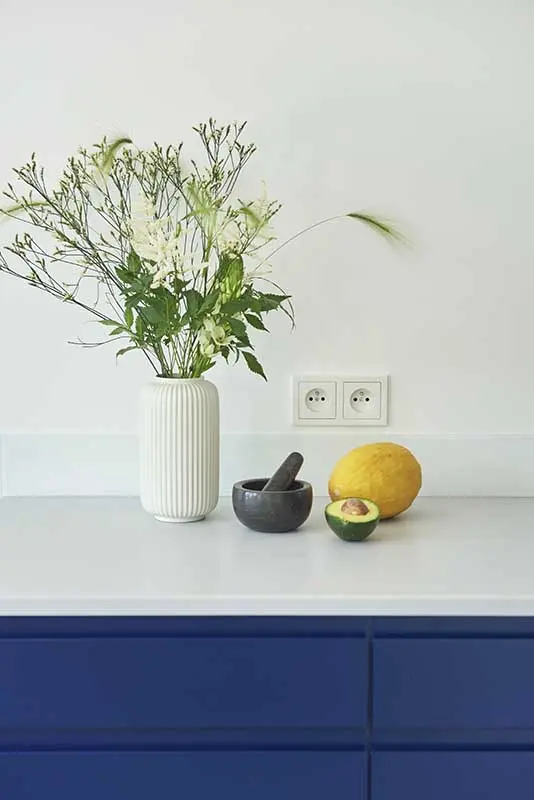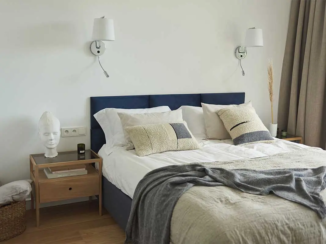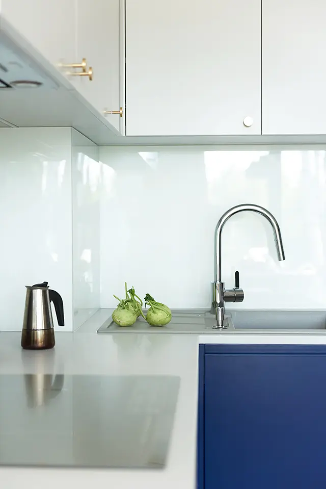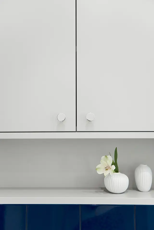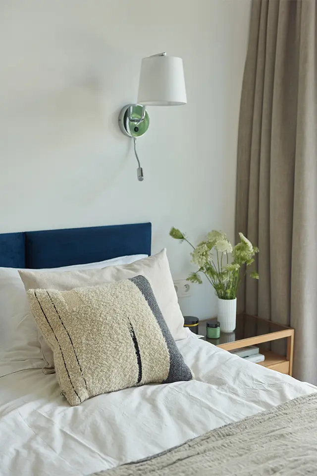 Mieszkanie znajduję się w nowoczesnym kompleksie mieszkań przy Forcie Piłsudskiego w Warszawie. Architekt Małgorzata Jaworska postawiła na stworzenie minimalistycznego, eleganckiego wnętrza w którym będzie dominować ulubiony kolor klientki. Granatowe dodatki dominują w każdym pomieszczeniu. Poprzez kobaltowe fronty szafek kuchennych, ciemno granatową glazurę w łazienkach, grzejniku wykonanym na zamówienie i welurowym zagłówku nad łóżkiem, klimat mieszkania przypomina śródziemnomorskie wybrzeże.