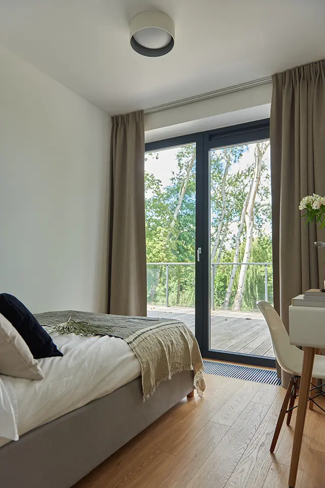 Przestrzeń składa się z otwartej kuchni połączonej z jadalnią, salonu, dwóch dużych sypialni, dwóch łazienek oraz garderoby. Największym atutem apartamentu jest podłużny taras otoczony fosą.
