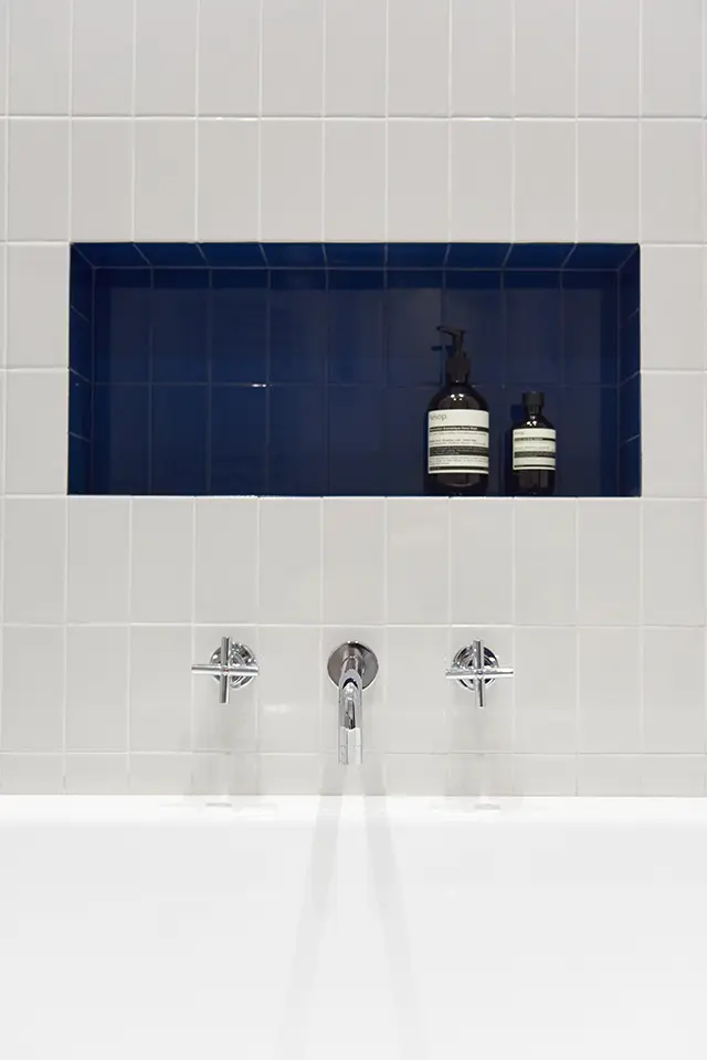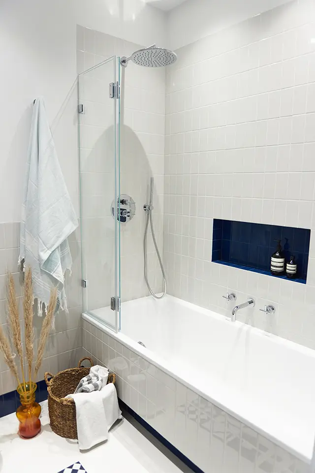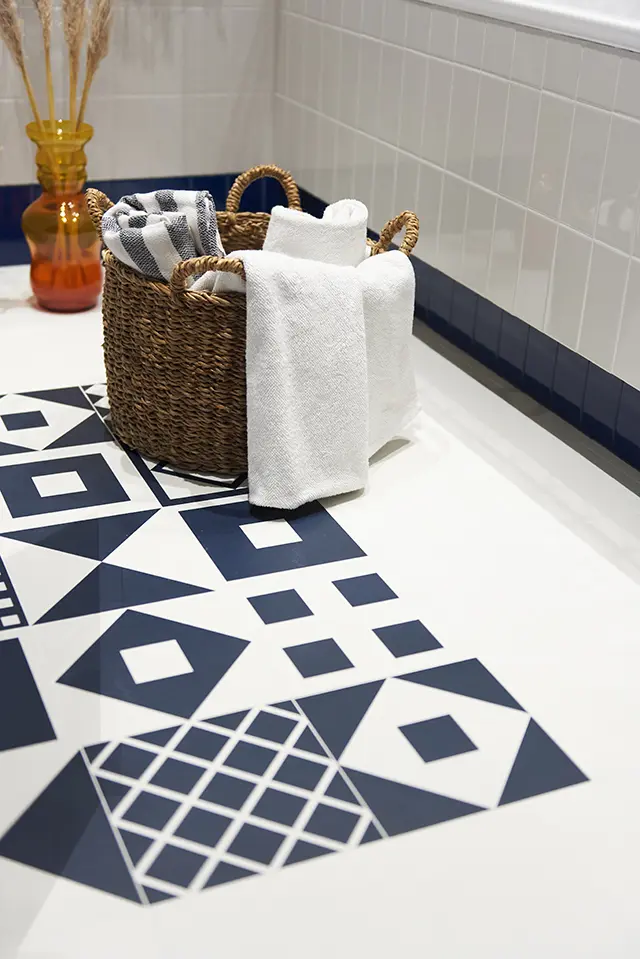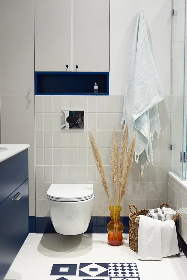 W niewielkiej łazience, w jasnych kolorach również znajdziemy akcenty w kolorze granatu. Jest to szafka pod umywalkowa jak również nietuzinkowe wzorzyste płytki.