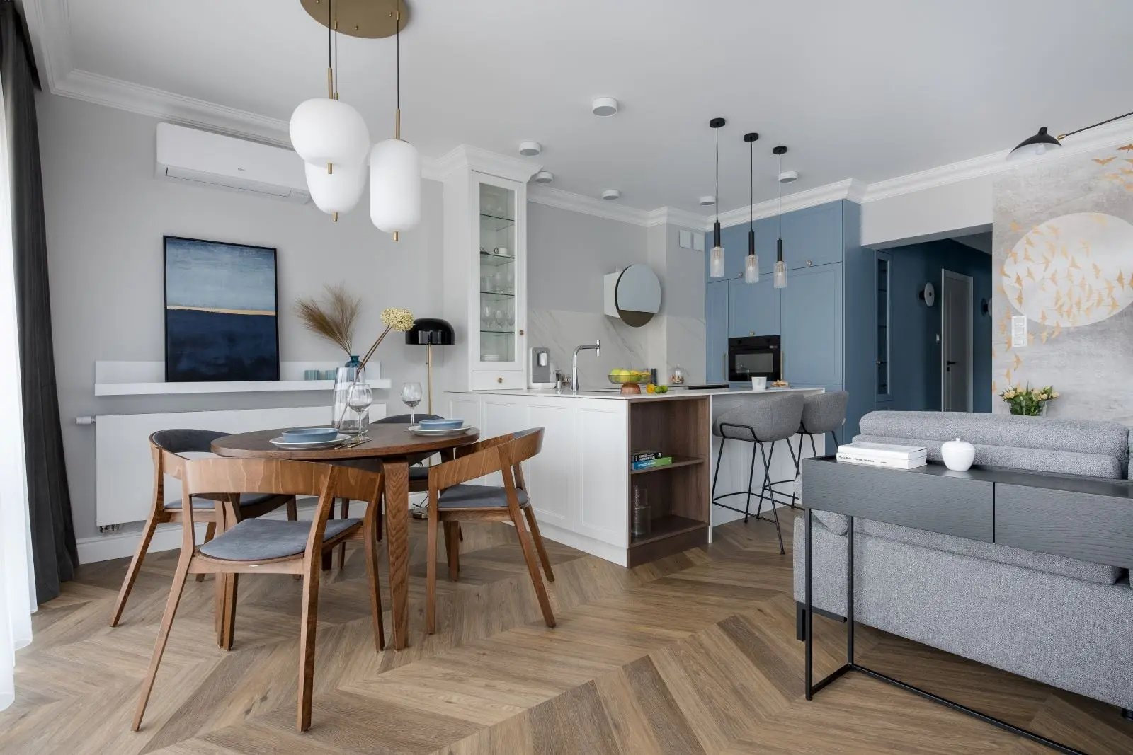 Wybór wysokiej jakości materiałów i sprzętów oraz aranżacja oparta na szlachetnych surowcach, takich jak naturalne drewno nadają wnętrzu elegancji i wyjątkowego charakteru. To również wpływa na zwiększenie trwałości i estetyki pomieszczenia. Deska drewniana jest piękna i klimatyczna, ale może być mniej odporna na intensywne użytkowanie, szczególnie w przypadku wynajmu krótkoterminowego, gdzie podłoga jest narażona na dużą ilość ruchu i obciążeń. Panele winylowe są znane z trwałości i łatwej konserwacji, co czyni je dobrym wyborem w takim przypadku. Wzór jodły węgierskiej dodaje charakteru całemu pomieszczeniu.