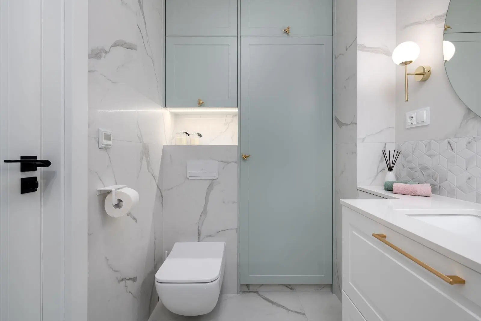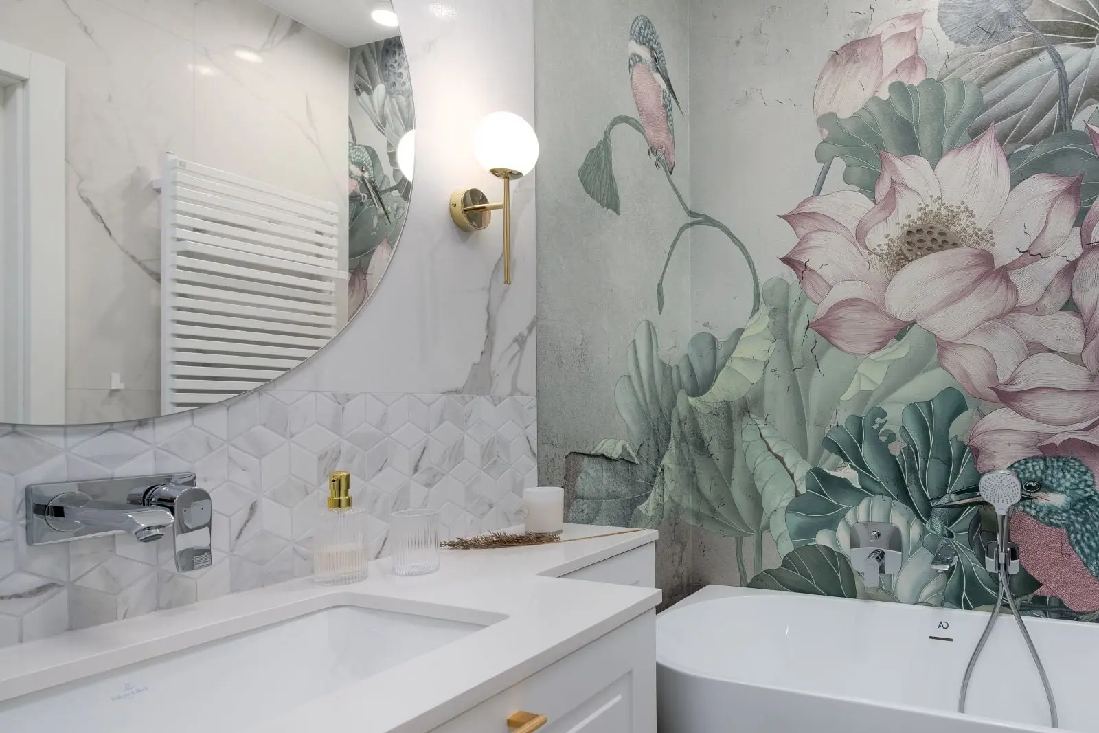 Łazienka jest niezwykle lekka i elegancka w odbiorze. Na ścianie za wanną wolnostojącą przyścienną, znalazła się wodoodporna tapeta WonderWall. W strefie umywalkowej oraz WC na ścianach znajdują się piękne delikatne płytki marmurowe. Chromowana armatura zwieńcza całość aranżacji, a blasku dodają kinkiety i złote finezyjne uchwyty.