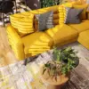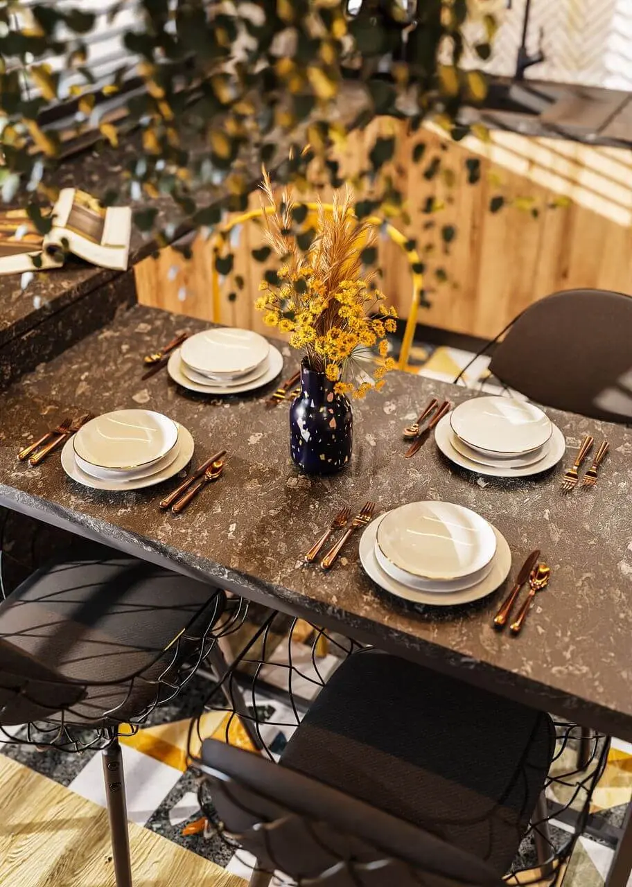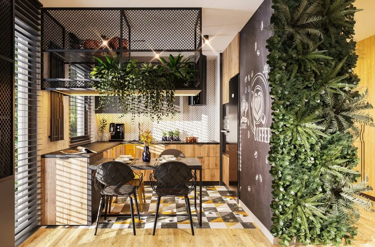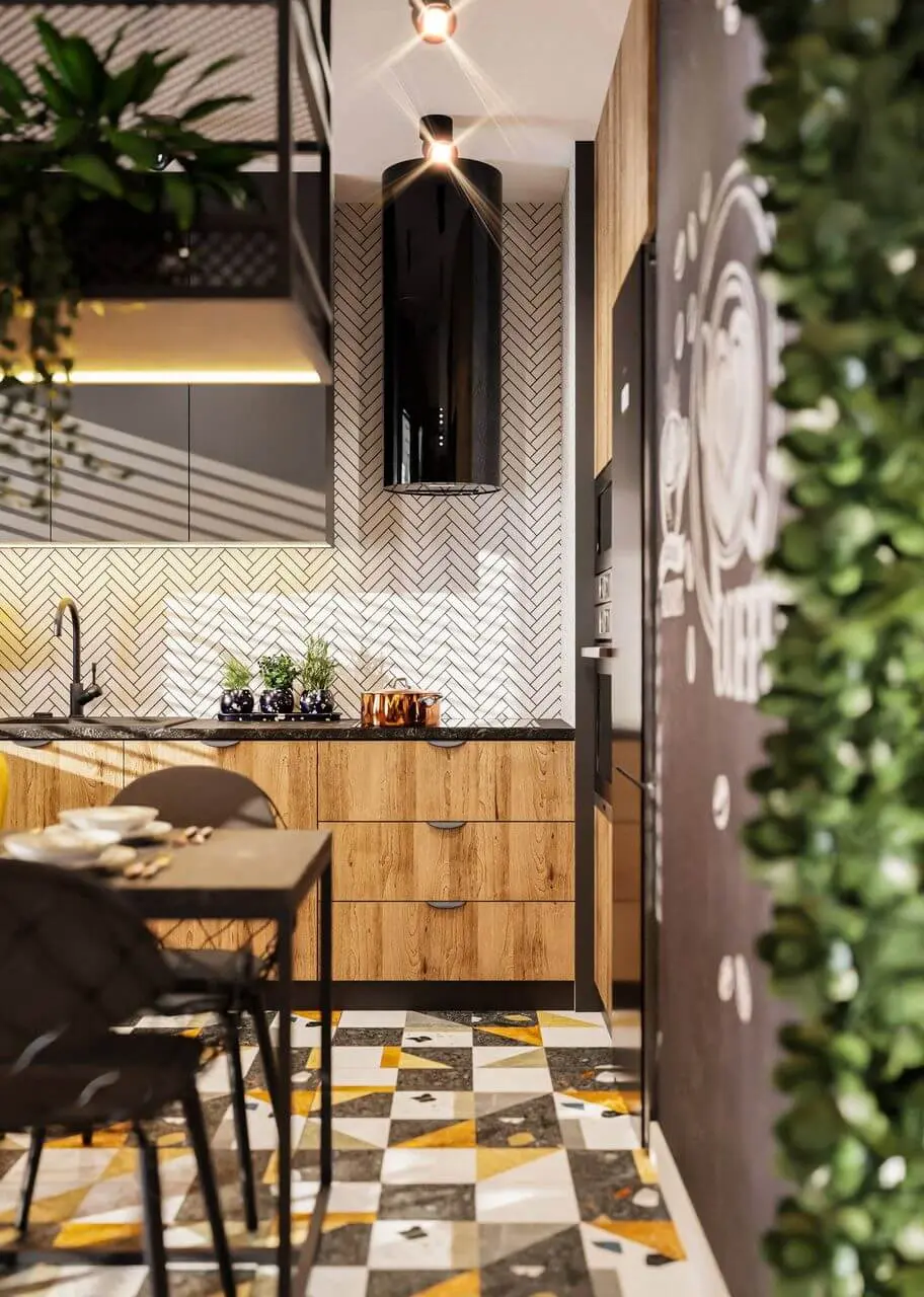 Ciekawym zabiegiem aranżacyjnym jest zestawienie matowej czerni z energetyczną żółcią, jak narożnik, dywan czy wzorzyste płytki na podłodze w kuchni.