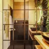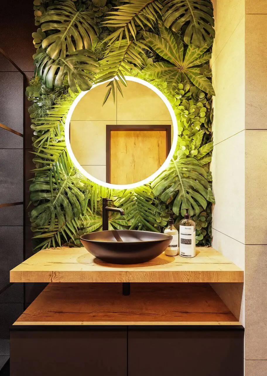 Rośliny stanowią ważny element dekoracyjny, praktycznie są w każdym pomieszczeniu. W łazience tworzą zieloną ścianę nad strefą umywalkową, otaczając okrągłe, podświetlane lustro. Przestrzeń jest spójna i harmonijna z resztą mieszkania, tu również mamy elementy loftowego wnętrza jak drewno, stal i beton.