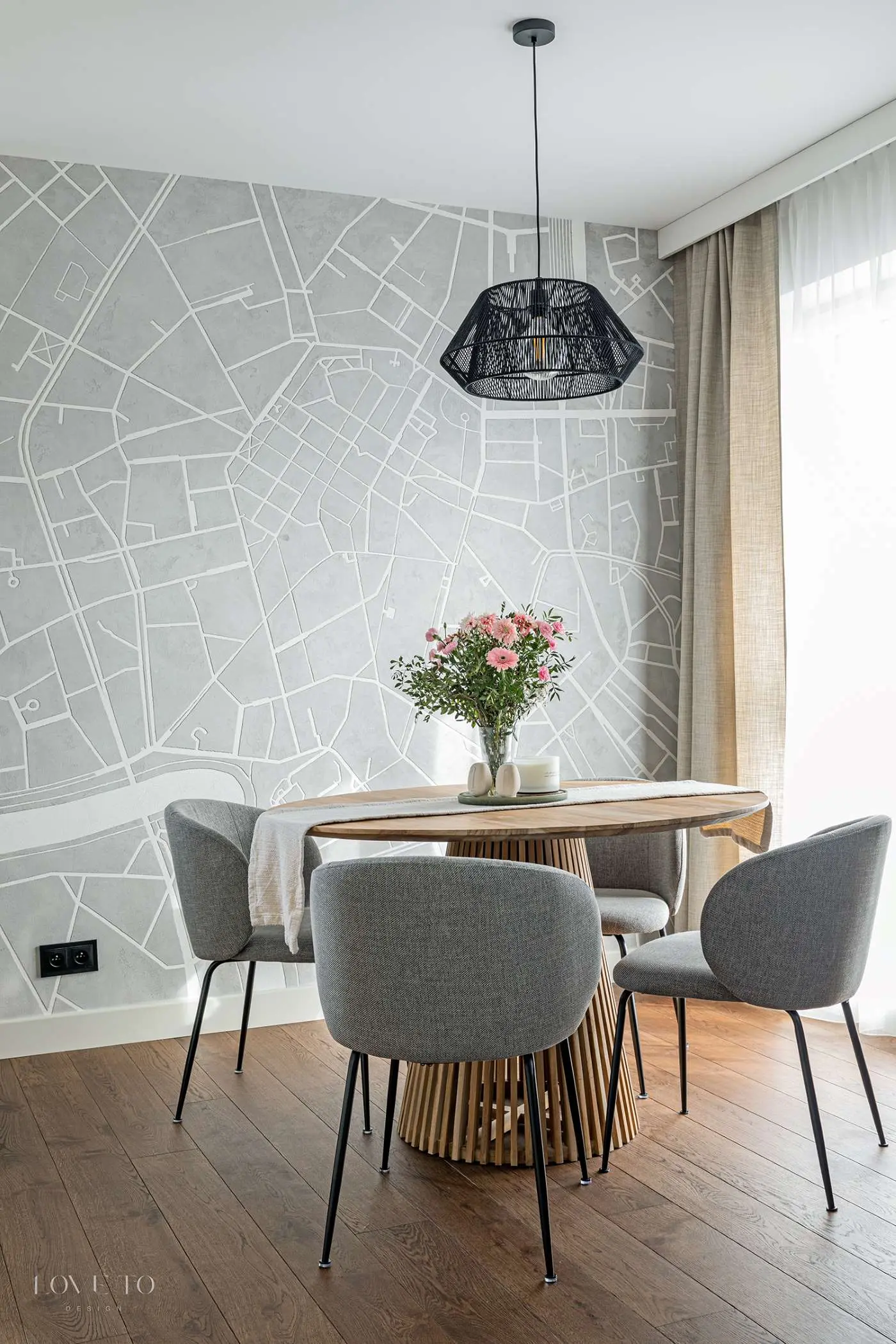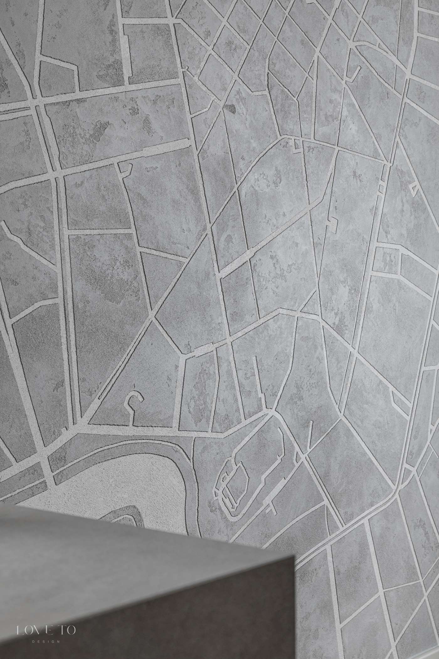 Aranżacyjnym motywem przewodnim mieszkania składającego się z otwartej kuchni na salon i jadalnię, sypialni oraz łazienki jest perfekcyjnie użycie tynku imitującego beton. Ciekawym i wyróżniającym akcentem wnętrza jest schematyczny rzut miasta na ścianie przy stole jadalnianym. Jest to linearna mapa Krakowa wykonana przez Moore Studio – motyw lotniczy, gdyż właściciel mieszkania jest pilotem.
