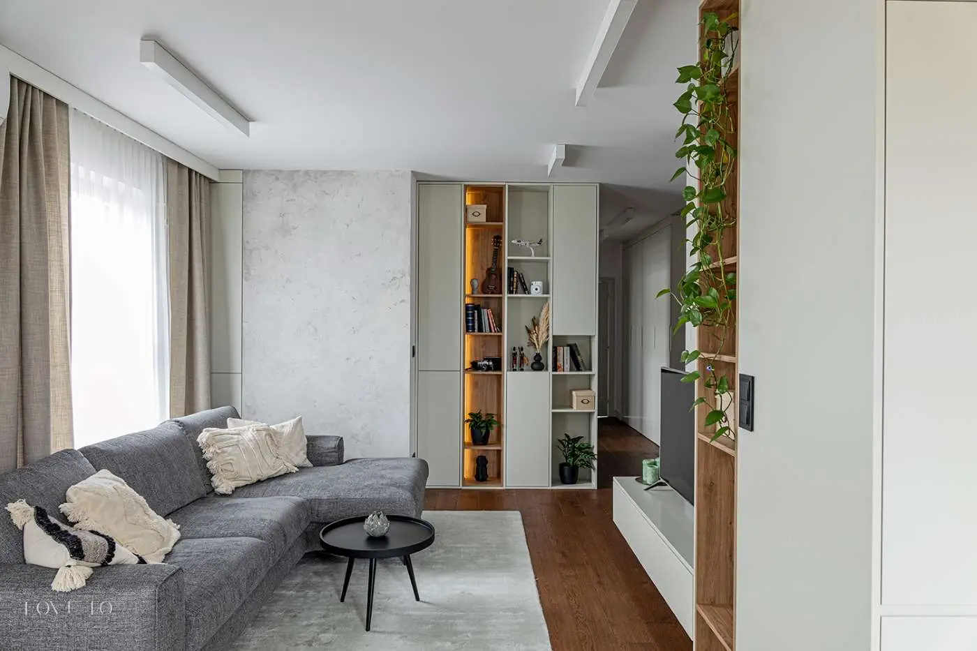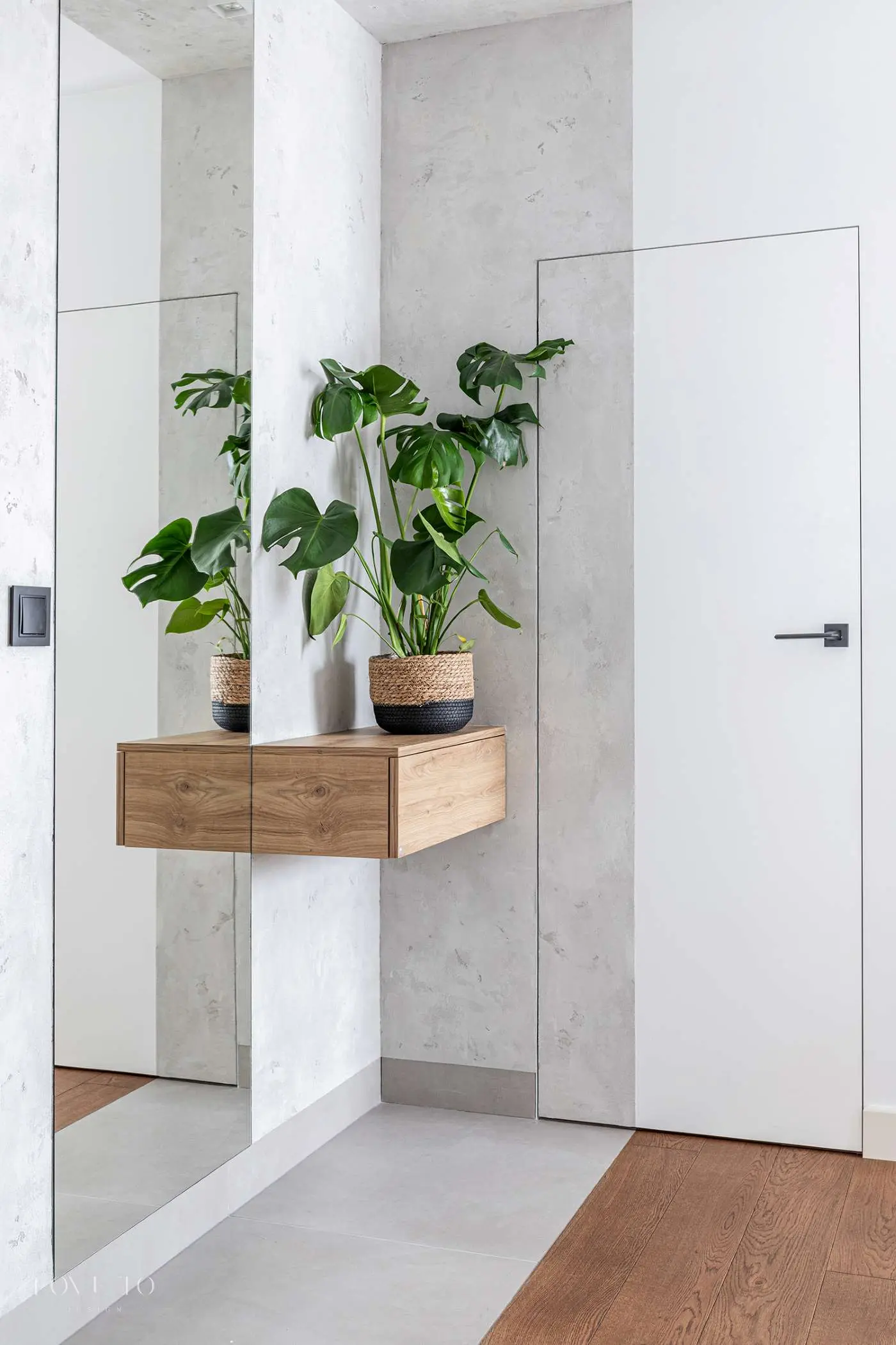 W mieszkaniu znajduję się dużo miejsca do przechowywania. Wszystkie zabudowy meblowe zostały wykonane na zamówienie według projektu architektek. Betonowym ścianom i szarościom dodaje ciepła pięknie wkomponowana drewniana podłoga.