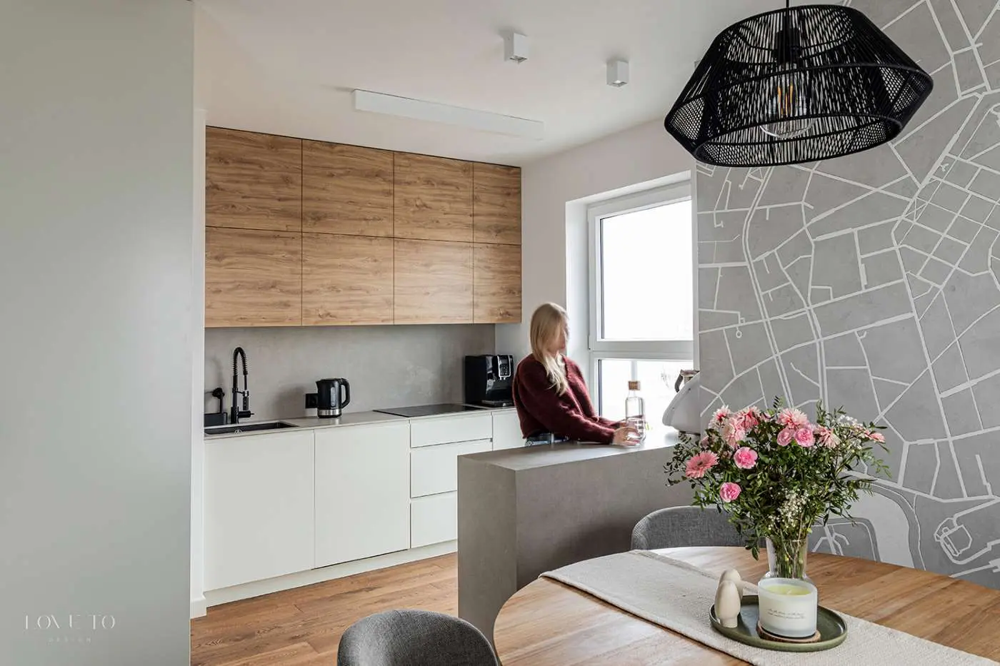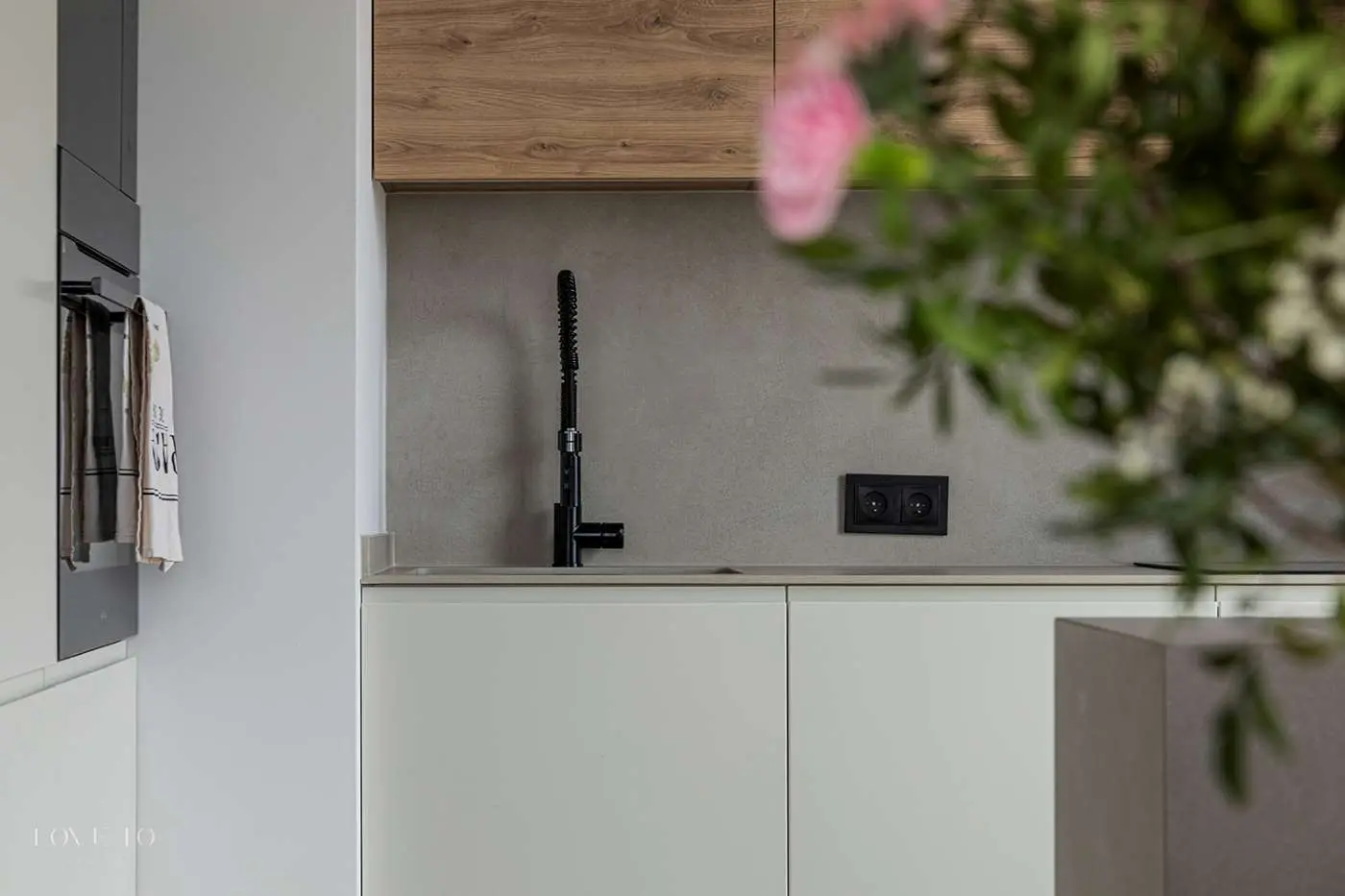 Górne szafki zostały wykonane z laminatu imitującego drewno natomiast beż to płyta lakierowana w wykończeniu matowym. Otwierane są za pomocą frezów. Blat roboczy oraz ściana nad nim wykończono szarą płytką wielkoformatową Marazzi, co ciekawe jest to ten sam materiał, z którego wykonana została również niewielka wyspa.